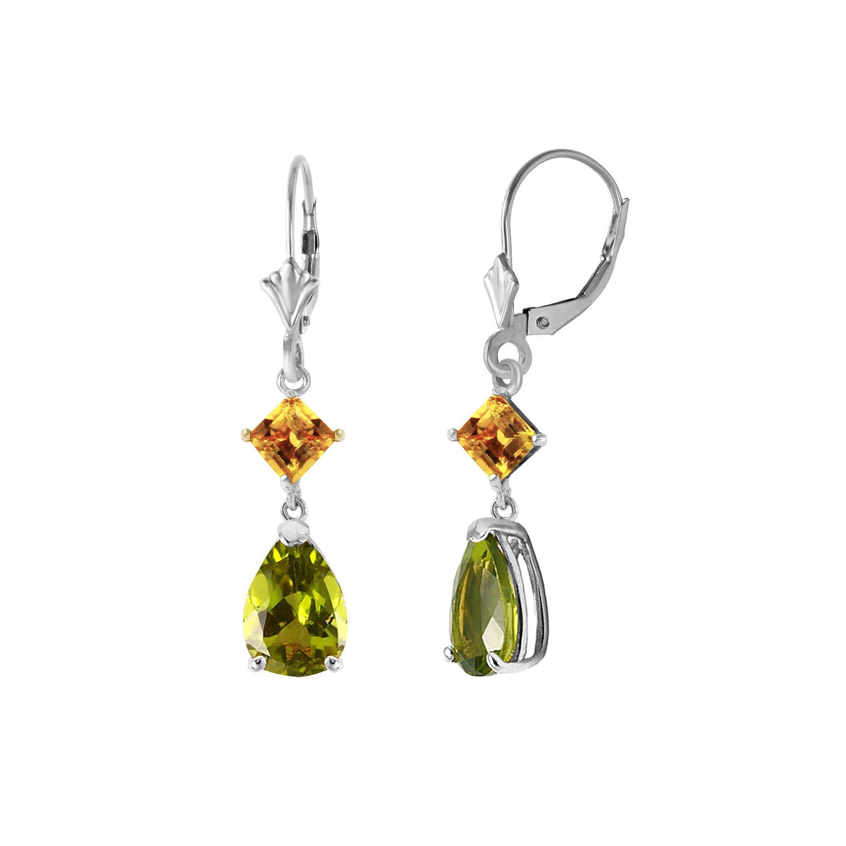 Peridot & Citrine Leverback Earrings handcrafted in solid white gold. Four gemstones, total 4.5 ct for both earrings combined. Pear cut. Size: 6.1 x 34.5 mm (0.24 x 1.36 in). Material: 9ct White Gold. Total metal weight: 2.1 gr. 2 pear cut peridots (9 x 6 mm) = 3.5 ct total for pair. 2 square cut citrines (4 x 4 mm) = 1 ct total for pair. Colour: Green. Stone cut: Pear Cut. Anniversary: 16th Anniversary. Birthstone: August.