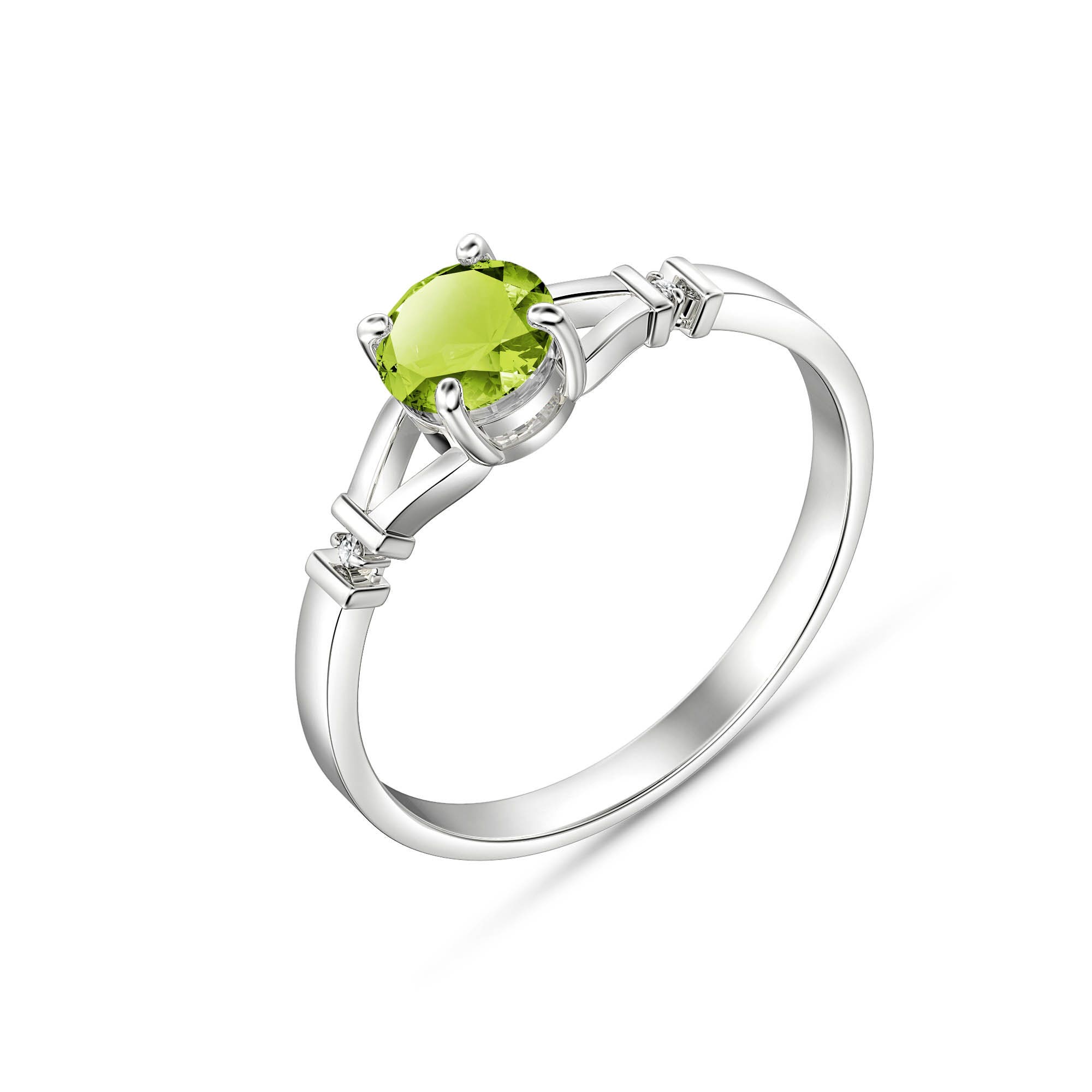 Peridot & Diamond Ring handcrafted in solid 18ct white gold. Single 0.85 ct genuine peridot, two diamonds, total 0.02 ct. Round cut. Available from sizes H to Z including half sizes. Size: 6.1 mm (0.24 in). Material: 18ct White Gold. Total metal weight: 1.9 gr. 1 round cut peridot (6 x 6 mm) = 0.85 ct. 2 round cut diamonds (K colour, SI2 clarity) = 0.02 ct total. Colour: Green. Stone cut: Round Cut. Anniversary: 16th Anniversary. Birthstone: August.