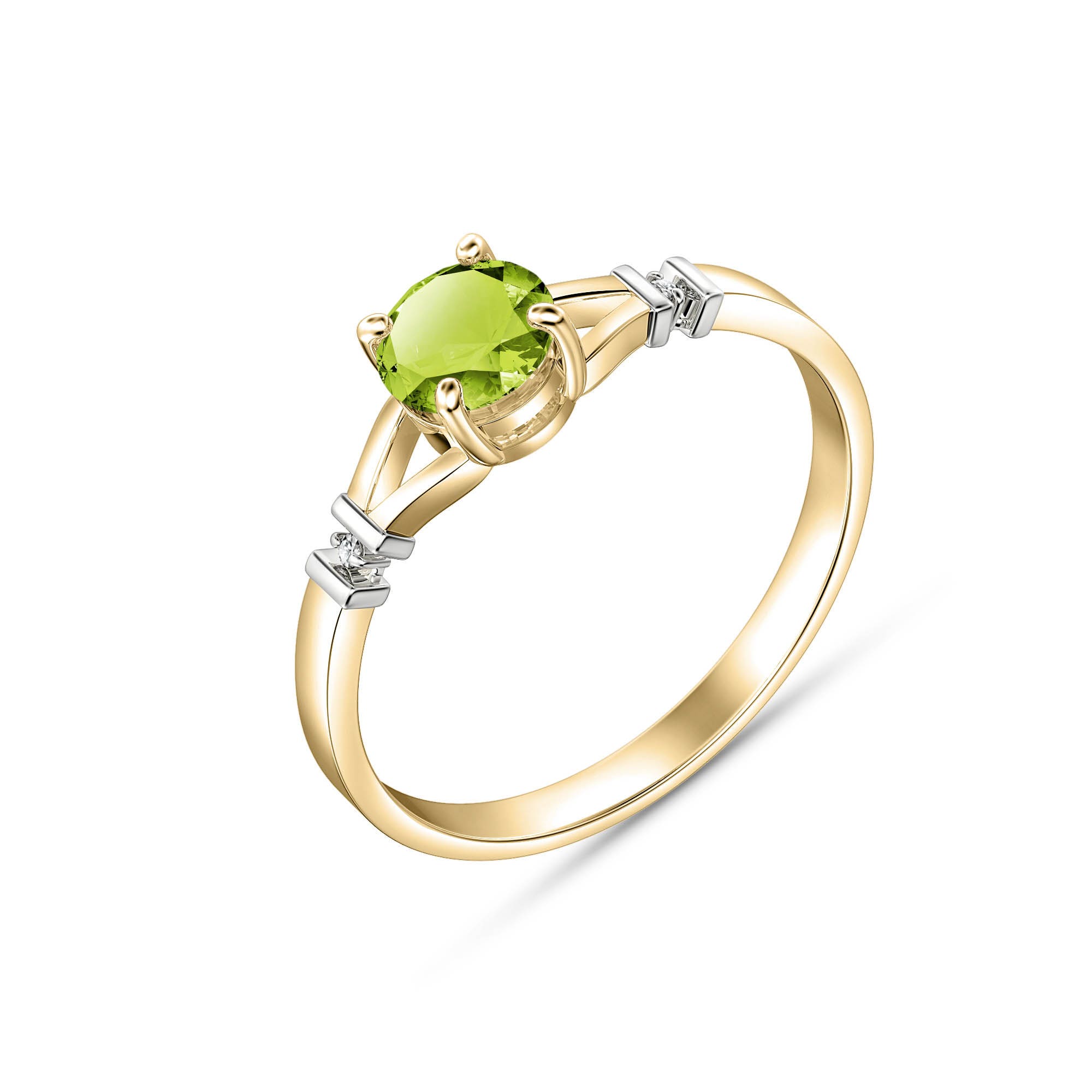 Peridot & Diamond Ring handcrafted in solid gold. Single 0.85 ct genuine peridot, two diamonds, total 0.02 ct. Round cut. Available from sizes H to Z including half sizes. Size: 6.1 mm (0.24 in). Material: 9ct Gold. Total metal weight: 1.4 gr. 1 round cut peridot (6 x 6 mm) = 0.85 ct. 2 round cut diamonds (K colour, SI2 clarity) = 0.02 ct total. Colour: Green. Stone cut: Round Cut. Anniversary: 16th Anniversary. Birthstone: August.