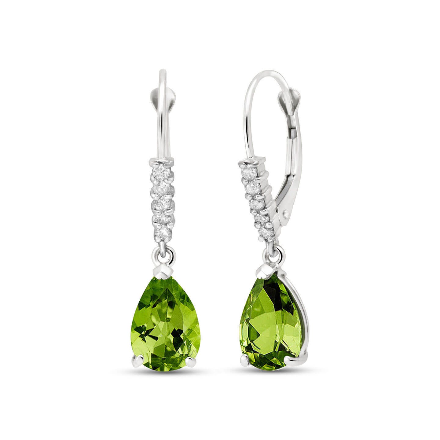 Peridot & Diamond Leverback Earrings handcrafted in solid white gold. Two genuine peridots, total 3 ct, ten diamonds, total 0.15 ct for both earrings combined. Pear cut. Size: 6.1 x 28.2 mm (0.24 x 1.11 in). Material: 9ct White Gold. Total metal weight: 1.9 gr. 2 pear cut peridots (9 x 6 mm) = 3 ct total for pair. 10 round cut diamonds (I colour, SI2 clarity) = 0.15 ct total for pair. Colour: Green. Stone cut: Pear Cut. Anniversary: 16th Anniversary. Birthstone: August.