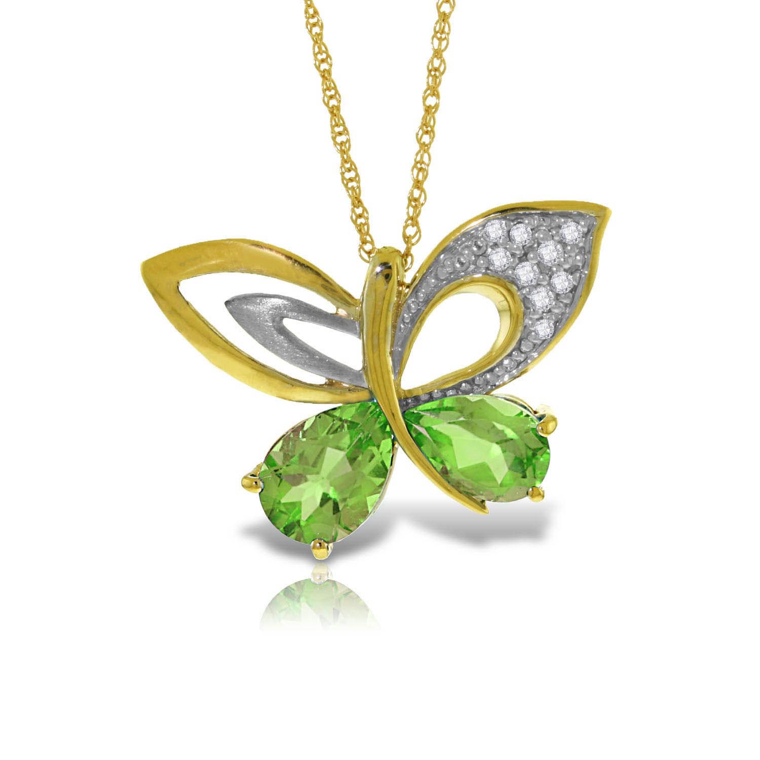 Peridot & Diamond Butterfly Pendant Necklace handcrafted in solid gold. Two gemstones, total 3.6 ct, nine diamonds, total 0.18 ct. Pear cut. The pendant hangs from a gold double link rope chain with spring clasp. Size: 27.9 x 19.8 mm (1.1 x 0.78 in). Material: 9ct Gold. Total metal weight: 4.24 gr. 1 pear cut peridot (10 x 7 mm) = 2.1 ct. 1 pear cut peridot (9 x 6 mm) = 1.5 ct. 9 round cut diamonds (K colour, I3 clarity) = 0.18 ct total. Colour: Green. Stone cut: Pear Cut. Anniversary: 16th Anniversary. Birthstone: August.