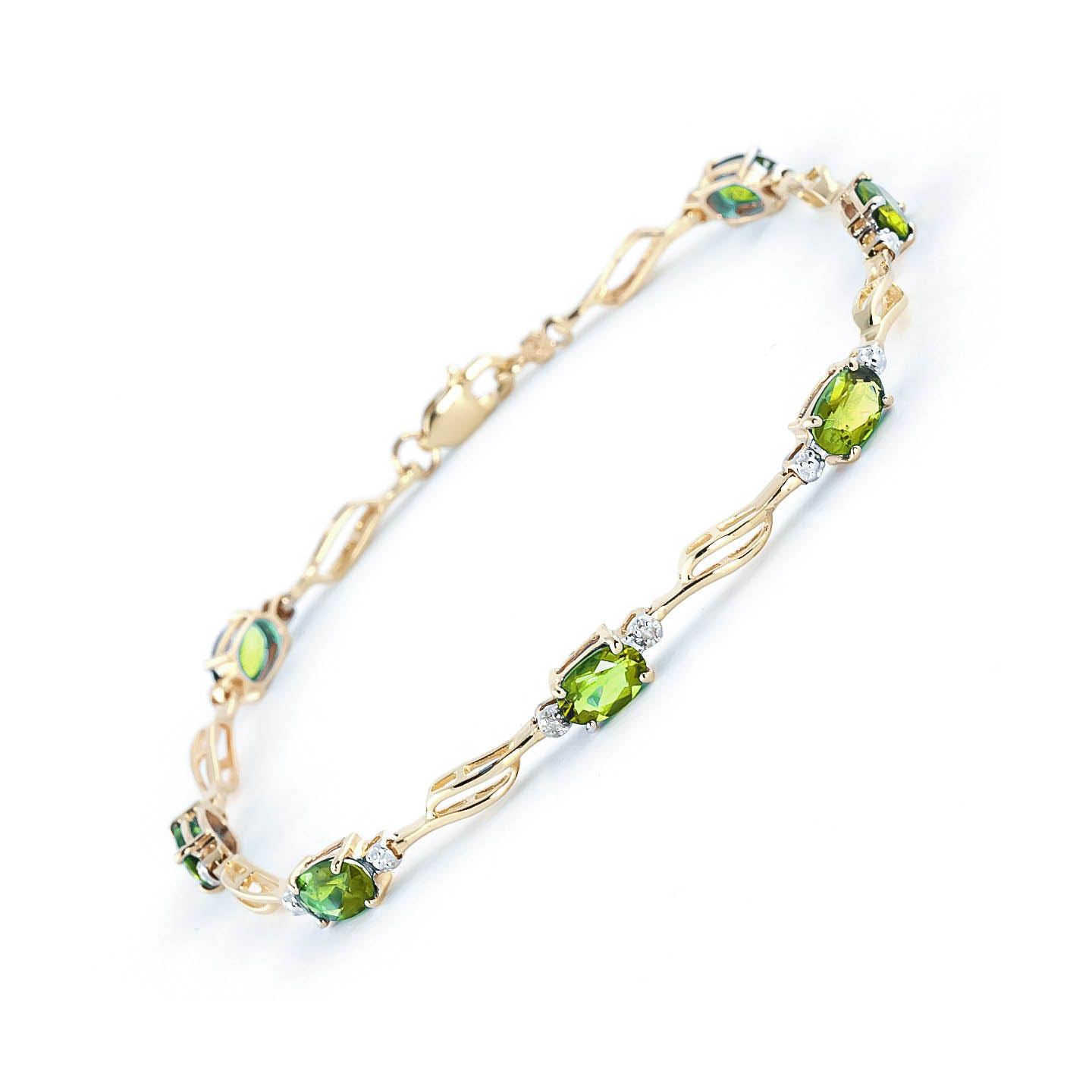 Peridot & Diamond Tennis Bracelet handcrafted in solid gold. Seven genuine peridots, total 3.38 ct, two diamonds, total 0.02 ct. Oval cut. Fastened by gold lobster clasp. Fits wrist up to 8.5″. Size: 4.3 mm (0.17 in). Material: 9ct Gold. Total metal weight: 4.4 gr. 7 oval cut peridots (6 x 4 mm) = 3.38 ct total. 2 round cut diamonds (K colour, SI1 clarity) = 0.02 ct total. Colour: Green. Stone cut: Oval Cut. Anniversary: 16th Anniversary. Birthstone: August.