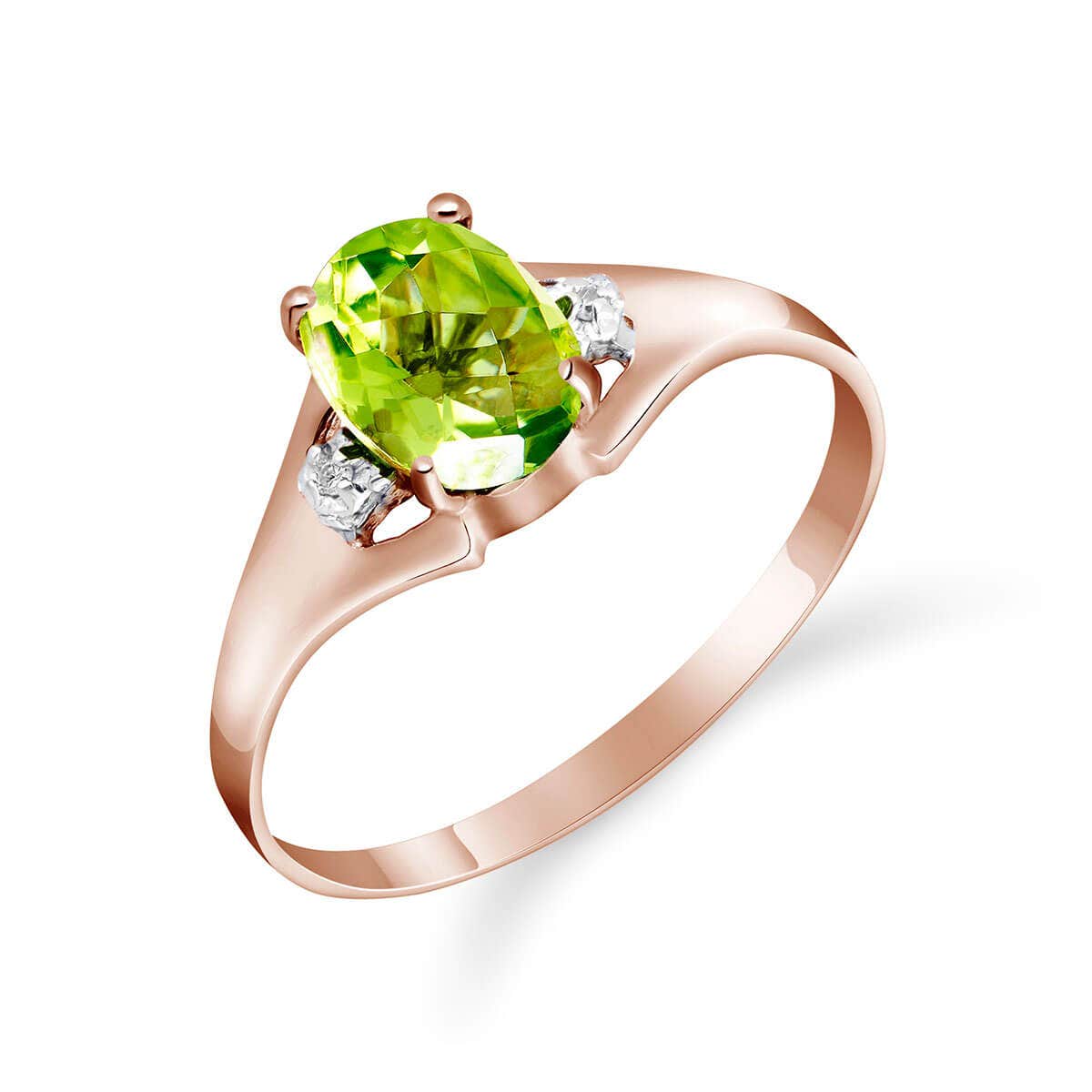 Peridot & Diamond Ring handcrafted in solid rose gold. Single 0.75 ct genuine peridot, two diamonds, total 0.01 ct. Oval cut. Available from sizes H to Z including half sizes. Size: 6.6 mm (0.26 in). Material: 9ct Rose Gold. Total metal weight: 1.1 gr. 1 oval cut peridot (7 x 5 mm) = 0.75 ct. 2 round cut diamonds (K colour, I3 clarity) = 0.01 ct total. Colour: Green. Stone cut: Oval Cut. Anniversary: 16th Anniversary. Birthstone: August.