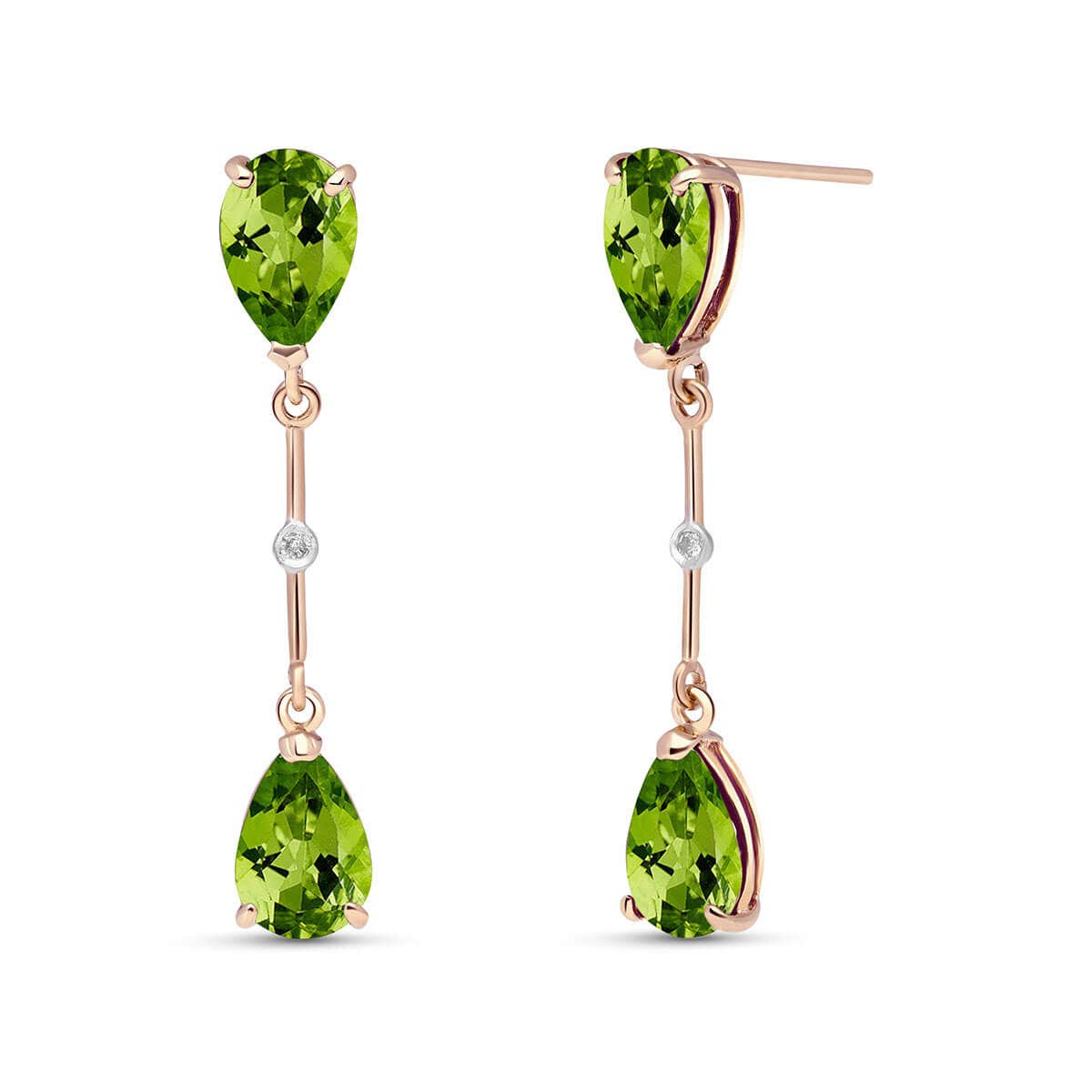 Peridot & Diamond Chandelierdrop Earrings handcrafted in rose gold plated 9ct gold. Four genuine peridots, total 6 ct, two diamonds, total 0.01 ct for both earrings combined. Pear cut. Size: 6.1 x 35.1 mm (0.24 x 1.38 in). Material: 9ct Rose Gold. Total metal weight: 2.6 gr. 4 pear cut peridots (9 x 6 mm) = 6 ct total for pair. 2 round cut diamonds (G colour, SI2 clarity) = 0.01 ct total for pair. Colour: Green. Stone cut: Pear Cut. Anniversary: 16th Anniversary. Birthstone: August.