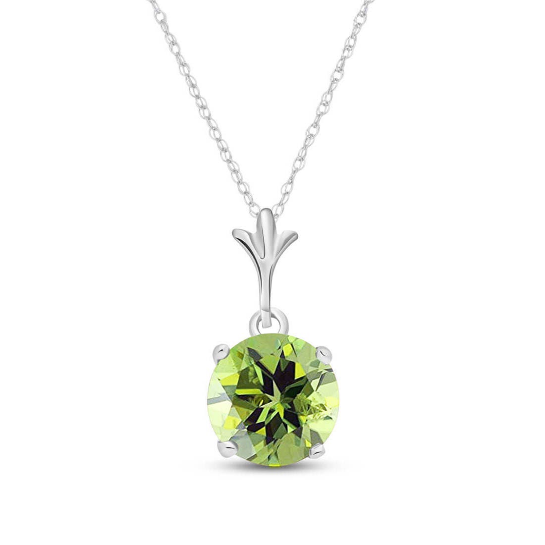 Peridot Pendant Necklace handcrafted in solid white gold. Single 1.15 ct genuine peridot. Round cut. The pendant is suspended from a white gold double link rope chain with spring clasp. Size: 7.1 x 14.7 mm (0.28 x 0.58 in). Material: 9ct White Gold. Total metal weight: 1.64 gr. 1 round cut peridot (7 x 7 mm) = 1.15 ct. Colour: Green. Stone cut: Round Cut. Anniversary: 16th Anniversary. Birthstone: August.
