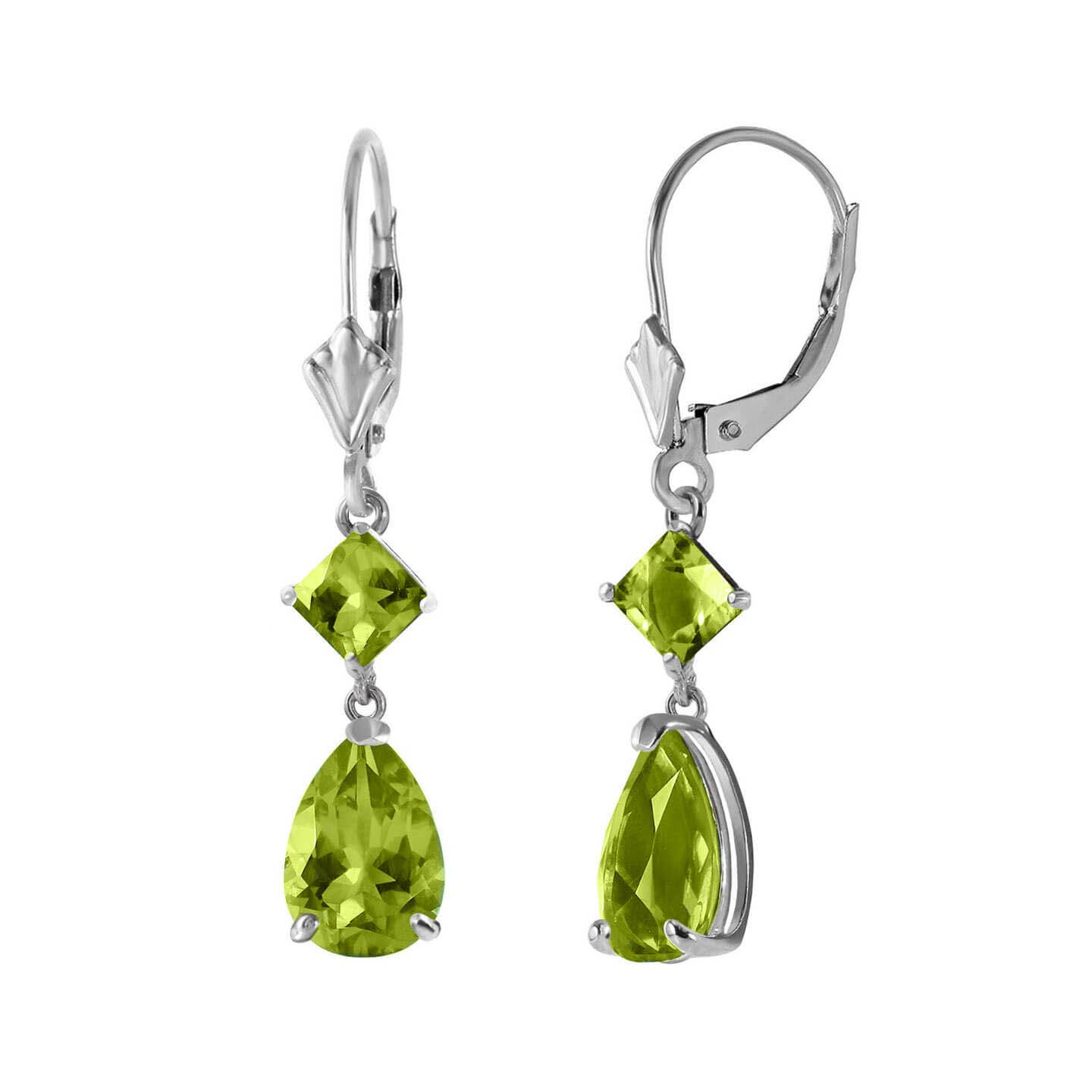 Peridot Leverback Earrings handcrafted in solid white gold. Four gemstones, total 4.5 ct for both earrings combined. Pear cut. Size: 6.1 x 34.5 mm (0.24 x 1.36 in). Material: 9ct White Gold. Total metal weight: 2.1 gr. 2 pear cut peridots (9 x 6 mm) = 3.5 ct total for pair. 2 square cut peridots (4 x 4 mm) = 1 ct total for pair. Colour: Green. Stone cut: Pear Cut. Anniversary: 16th Anniversary. Birthstone: August.