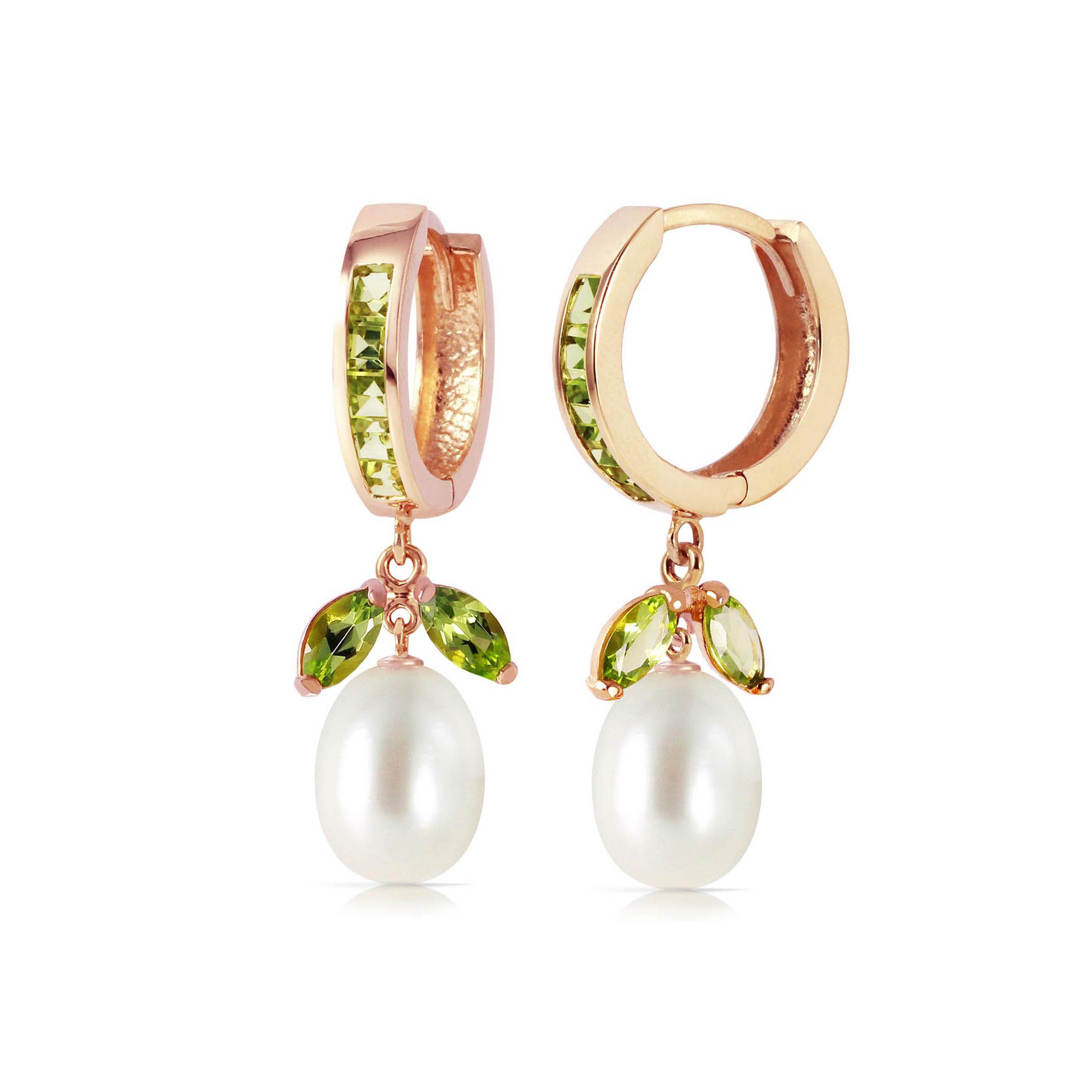 Peridot & Pearl Hoop Earrings handcrafted in rose gold plated 9ct gold. 16 gemstones, total 10.3 ct for both earrings combined. Princess cut. Size: 10.9 x 32.5 mm (0.43 x 1.28 in). Material: 9ct Rose Gold. Total metal weight: 3.7 gr. 10 princess cut peridots (2.5 x 2.5 mm) = 1.3 ct total for pair. 2 freshwater pearls (10 x 8 mm) = 8 ct total for pair. 4 marquise cut peridots (6 x 3 mm) = 1 ct total for pair. Colour: Green. Stone cut: Princess Cut. Anniversary: 16th Anniversary. Birthstone: August.
