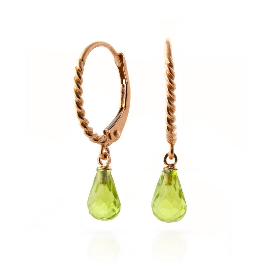 Peridot Leverback Earrings handcrafted in rose gold plated 9ct gold. Two genuine peridots, total 3 ct for both earrings combined. Briolette cut. Size: 5.1 x 26.9 mm (0.2 x 1.06 in). Material: 9ct Rose Gold. Total metal weight: 1.4 gr. 2 briolette cut peridots (7 x 5 mm) = 3 ct total for pair. Colour: Green. Stone cut: Briolette Cut. Anniversary: 16th Anniversary. Birthstone: August.