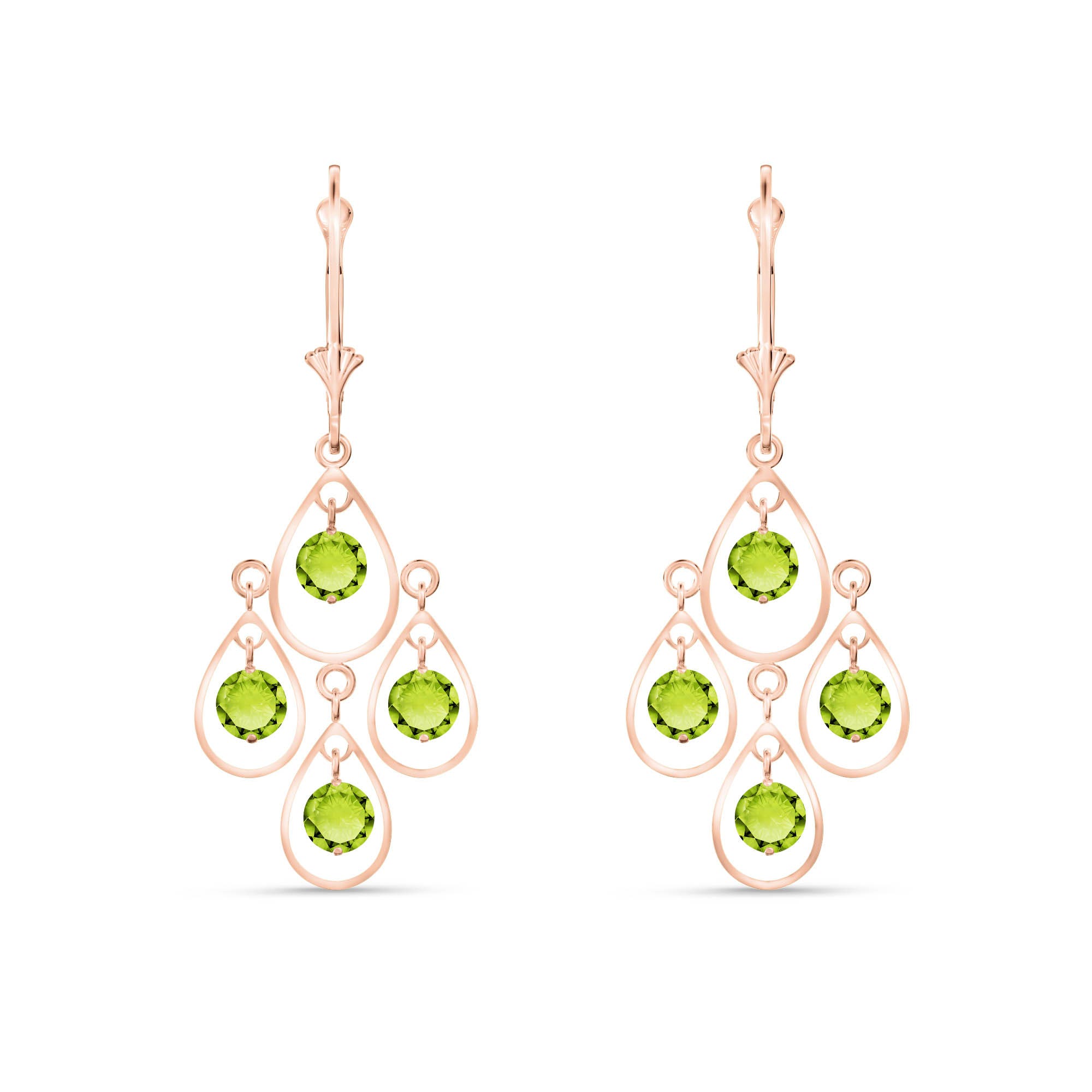 Chandelierdrop Earrings handcrafted in rose gold plated 9ct gold. Eight genuine peridots, total 2.4 ct for both earrings combined. Round cut. Size: 18 x 41.1 mm (0.71 x 1.62 in). Material: 9ct Rose Gold. Total metal weight: 2.7 gr. 8 round cut peridots (4 x 4 mm) = 2.4 ct total for pair. Colour: Green. Stone cut: Round Cut. Anniversary: 16th Anniversary. Birthstone: August.