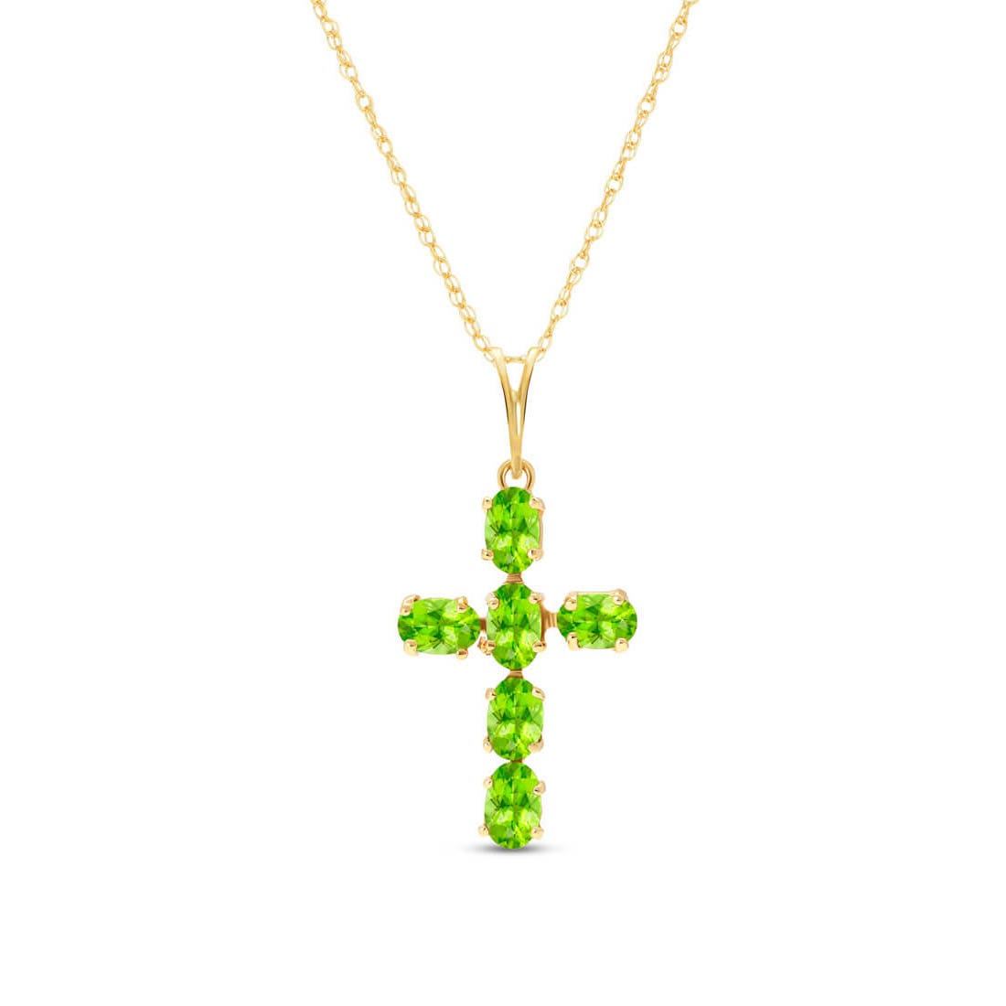 Peridot Cross Pendant Necklace handcrafted in solid gold. Six genuine peridots, total 1.5 ct. Oval cut. The pendant hangs from a gold double link rope chain with spring clasp. Size: 14 x 26.7 mm (0.55 x 1.05 in). Material: 9ct Gold. Total metal weight: 2.24 gr. 6 oval cut peridots (5 x 3 mm) = 1.5 ct total. Colour: Green. Stone cut: Oval Cut. Anniversary: 16th Anniversary. Birthstone: August.