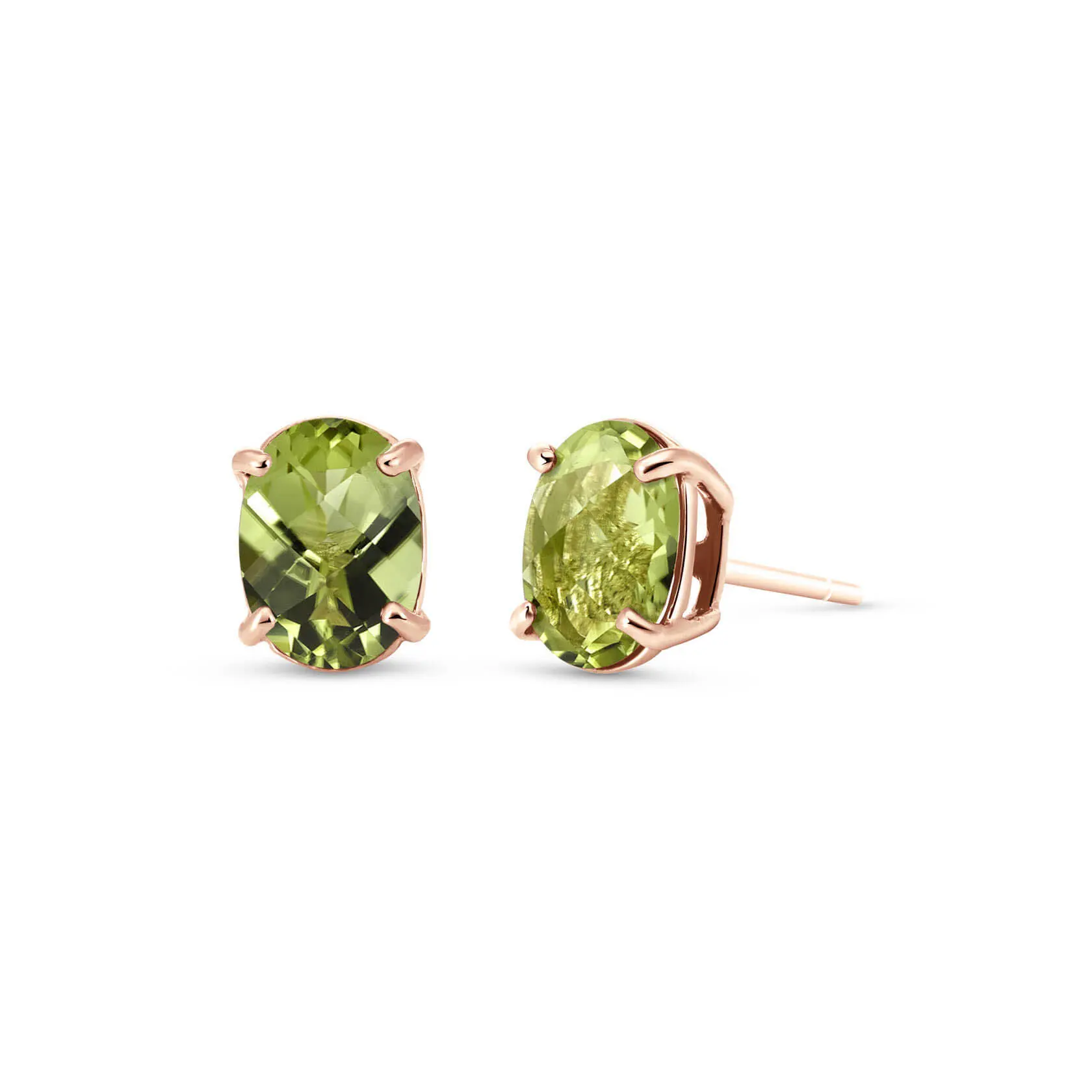 Peridot Stud Earrings handcrafted in rose gold plated 9ct gold. Two genuine peridots, total 1.8 ct for both earrings combined. Oval cut. Post with friction back to fasten. Size: 5.1 x 7.1 mm (0.2 x 0.28 in). Material: 9ct Rose Gold. Total metal weight: 0.9 gr. 2 oval cut peridots (7 x 5 mm) = 1.8 ct total for pair. Colour: Green. Stone cut: Oval Cut. Anniversary: 16th Anniversary. Birthstone: August.
