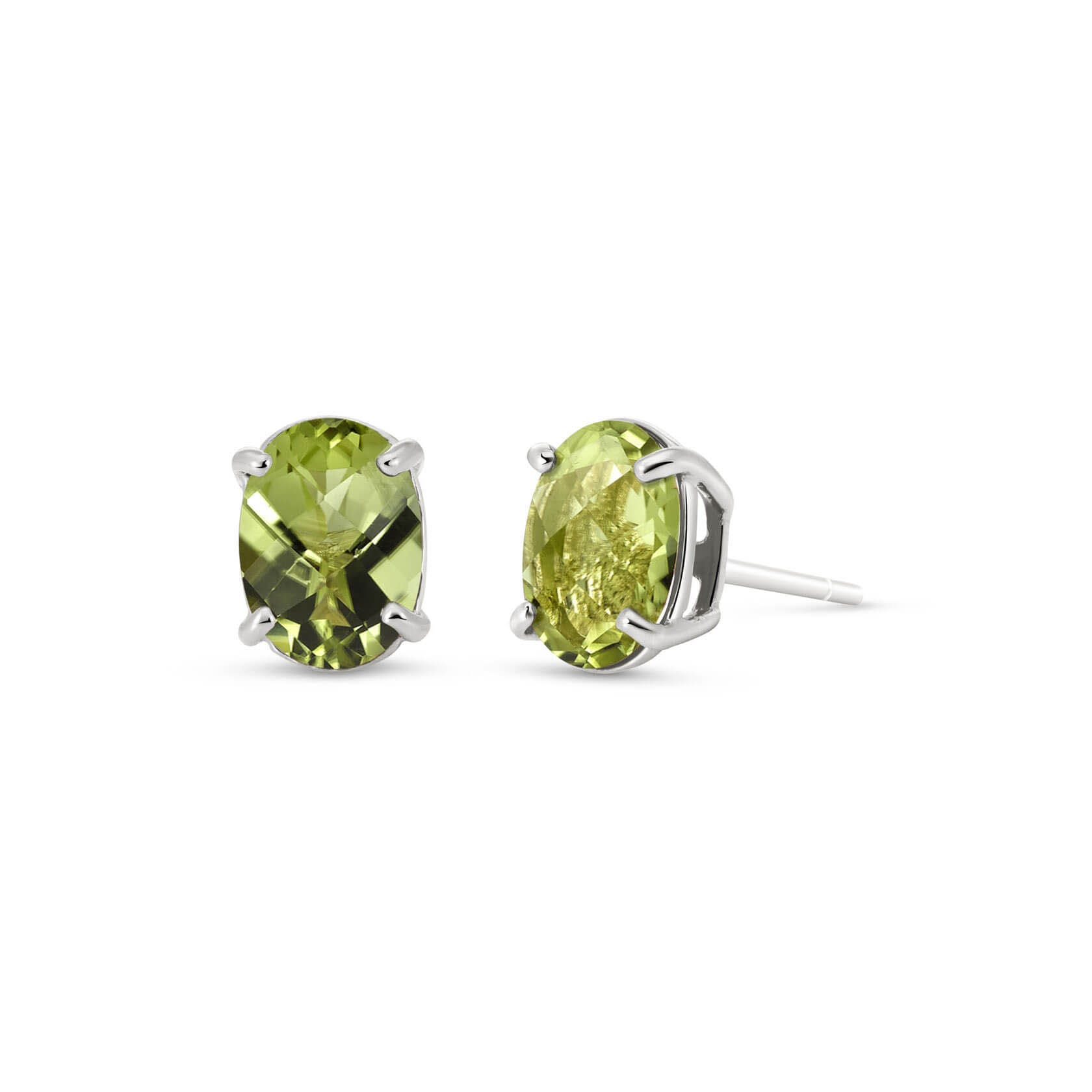 Peridot Stud Earrings handcrafted in solid white gold. Two genuine peridots, total 1.8 ct for both earrings combined. Oval cut. Post with friction back to fasten. Size: 5.1 x 7.1 mm (0.2 x 0.28 in). Material: 9ct White Gold. Total metal weight: 0.9 gr. 2 oval cut peridots (7 x 5 mm) = 1.8 ct total for pair. Colour: Green. Stone cut: Oval Cut. Anniversary: 16th Anniversary. Birthstone: August.