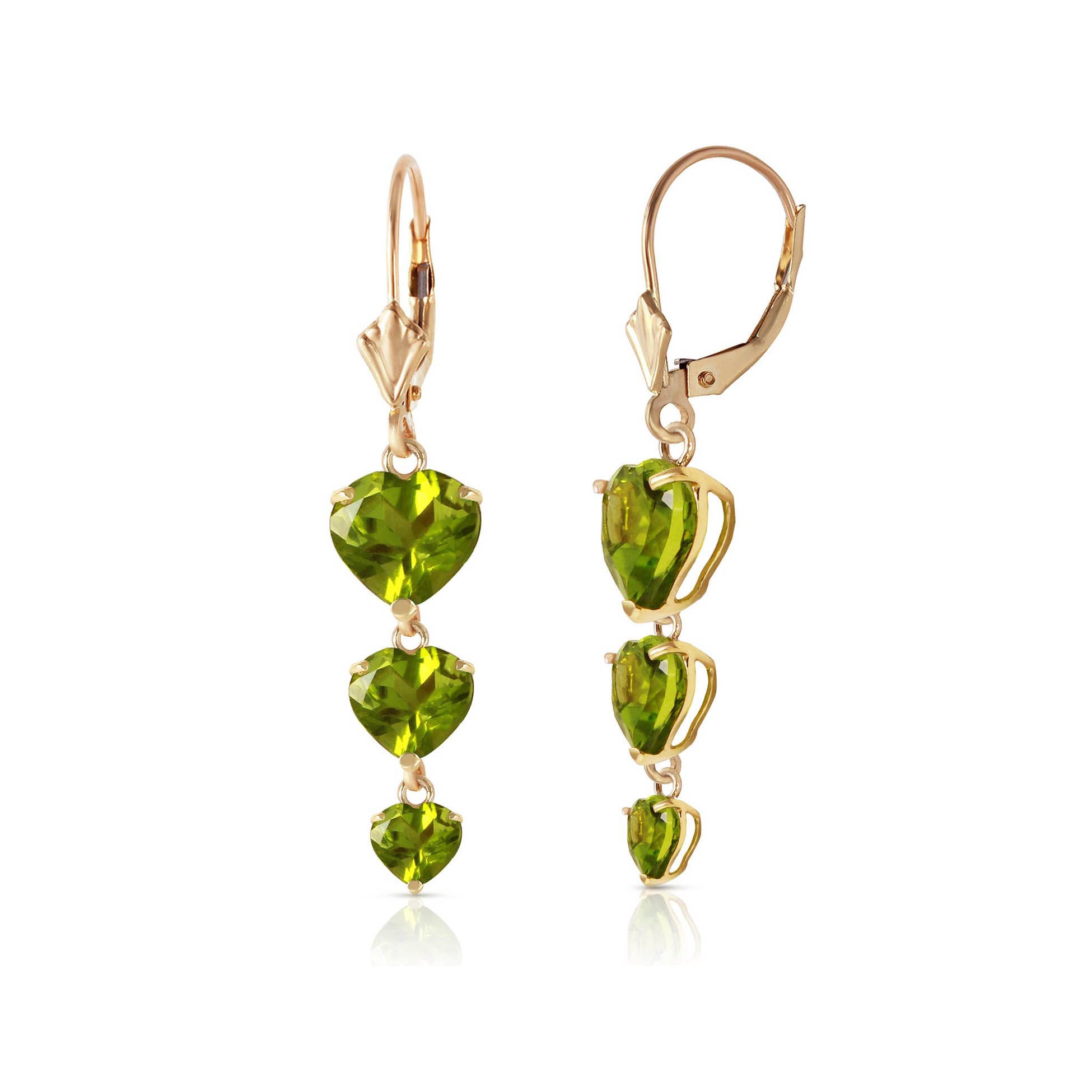 Peridot Chandelier Earrings handcrafted in solid gold. Six gemstones, total 6 ct for both earrings combined. Heart shaped. Size: 7.1 x 41.4 mm (0.28 x 1.63 in). Material: 9ct Gold. Total metal weight: 3.7 gr. 2 heart shaped peridots (7 x 7 mm) = 3 ct total for pair. 2 heart shaped peridots (6 x 6 mm) = 1.75 ct total for pair. 2 heart shaped peridots (5 x 5 mm) = 1.25 ct total for pair. Colour: Green. Stone cut: Heart Shaped. Anniversary: 16th Anniversary. Birthstone: August.