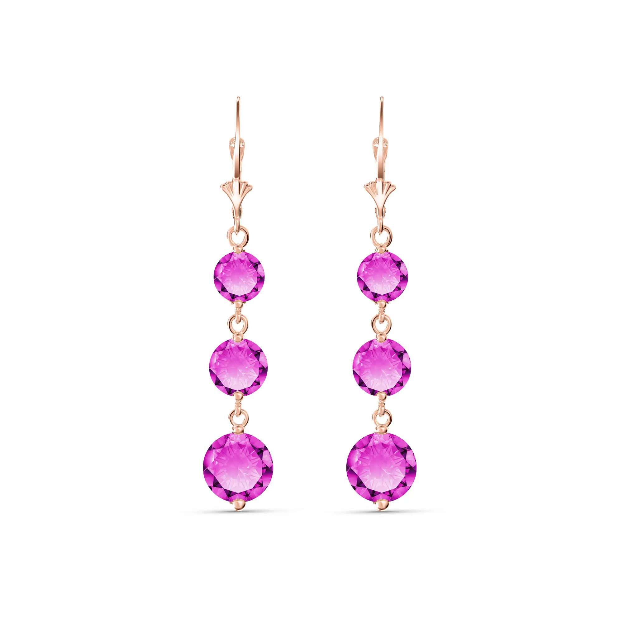 Chandelierdrop Earrings handcrafted in rose gold plated 9ct gold. Six gemstones, total 7.2 ct for both earrings combined. Round cut. Size: 7.1 x 43.2 mm (0.28 x 1.7 in). Material: 9ct Rose Gold. Total metal weight: 2.6 gr. 2 round cut pink topaz (7 x 7 mm) = 3.9 ct total for pair. 2 round cut pink topaz (6 x 6 mm) = 2.1 ct total for pair. 2 round cut blue topaz (5 x 5 mm) = 1.2 ct total for pair. Colour: Pink. Stone cut: Round Cut. Anniversary: 4th Anniversary. Birthstone: November.