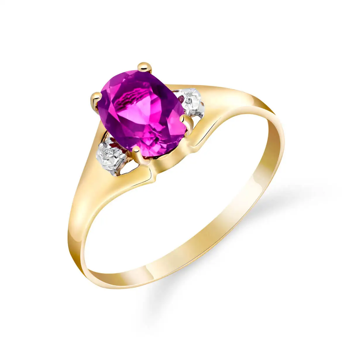 Pink Topaz & Diamond Ring handcrafted in solid 18ct gold. Single 0.75 ct genuine topaz, two diamonds, total 0.01 ct. Oval cut. Available from sizes H to Z including half sizes. Size: 6.6 mm (0.26 in). Material: 18ct Gold. Total metal weight: 1.5 gr. 1 oval cut pink topaz (7 x 5 mm) = 0.75 ct. 2 round cut diamonds (K colour, I3 clarity) = 0.01 ct total. Colour: Pink. Stone cut: Oval Cut. Anniversary: 4th Anniversary. Birthstone: November.