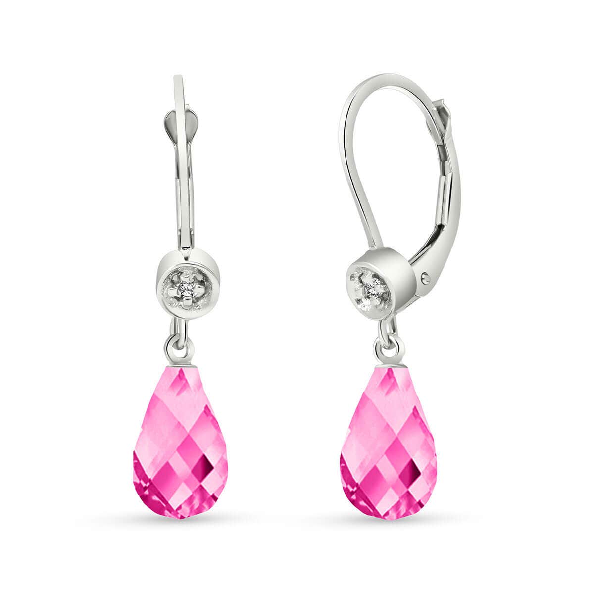 Pink Topaz & Diamond Leverback Earrings handcrafted in solid white gold. Two genuine topaz, total 4.5 ct, two diamonds, total 0.03 ct for both earrings combined. Briolette cut. Size: 4.1 x 27.7 mm (0.16 x 1.09 in). Material: 9ct White Gold. Total metal weight: 1.7 gr. 2 briolette cut pink topaz (9 x 6 mm) = 4.5 ct total for pair. 2 round cut diamonds (K colour, SI2 clarity) = 0.03 ct total for pair. Colour: Pink. Stone cut: Briolette Cut. Anniversary: 4th Anniversary. Birthstone: November.