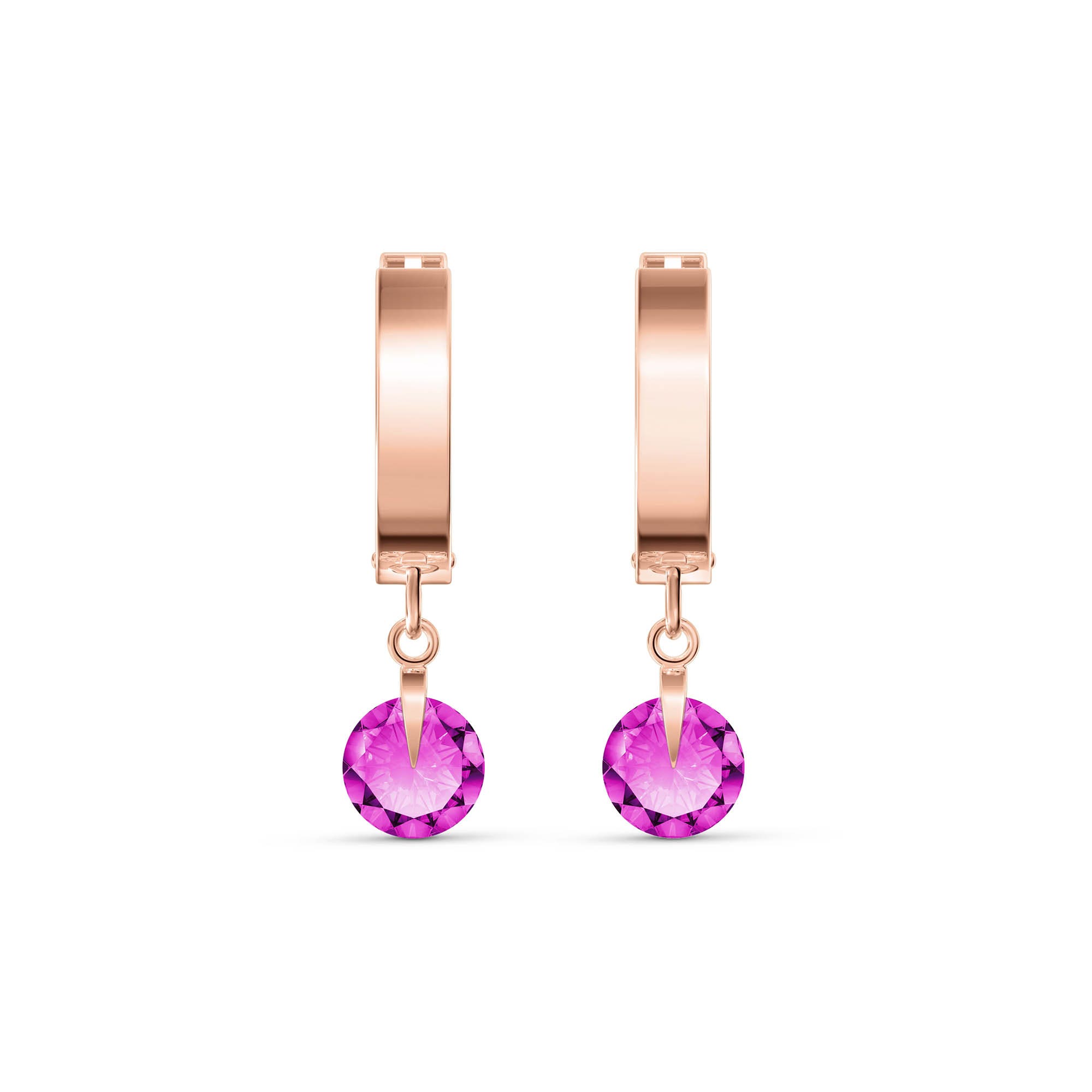 Hoop Earrings handcrafted in rose gold plated 9ct gold. Two genuine topaz, total 2 ct for both earrings combined. Round cut. Size: 6.1 x 22.9 mm (0.24 x 0.9 in). Material: 9ct Rose Gold. Total metal weight: 1.4 gr. 2 round cut pink topaz (6 x 6 mm) = 2 ct total for pair. Colour: Pink. Stone cut: Round Cut. Anniversary: 4th Anniversary. Birthstone: November.