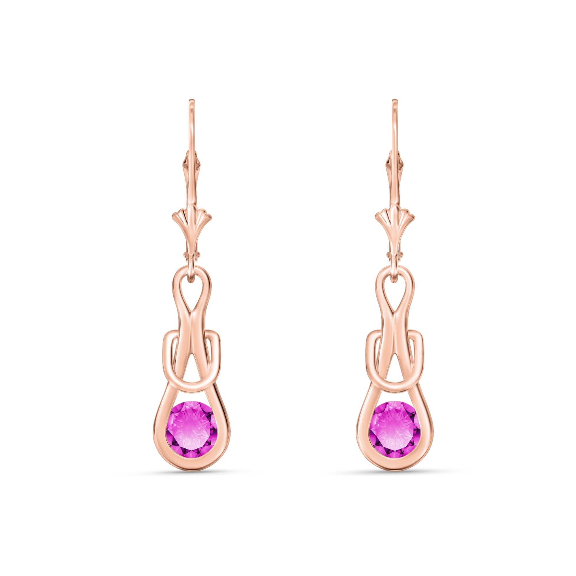 Leverback Earrings handcrafted in rose gold plated 9ct gold. Two genuine topaz, total 1.3 ct for both earrings combined. Round cut. Size: 7.4 x 33.5 mm (0.29 x 1.32 in). Material: 9ct Rose Gold. Total metal weight: 2.3 gr. 2 round cut pink topaz (5 x 5 mm) = 1.3 ct total for pair. Colour: Pink. Stone cut: Round Cut. Anniversary: 4th Anniversary. Birthstone: November.