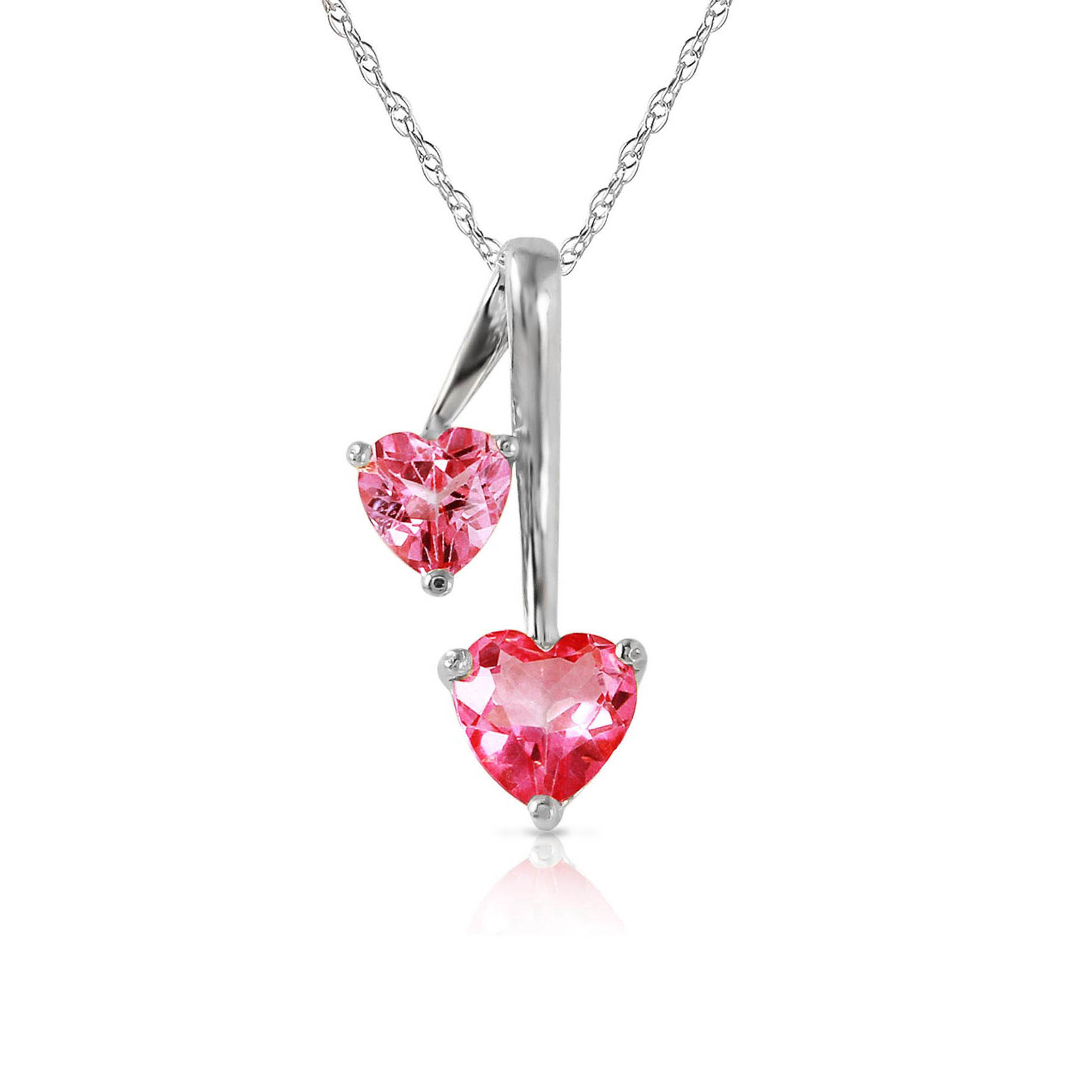 Pink Topaz Pendant Necklace handcrafted in solid white gold. Two gemstones, total 1.4 ct. Heart shaped. The pendant hangs from a white gold double link rope chain with spring clasp. Size: 9.7 x 20.3 mm (0.38 x 0.8 in). Material: 9ct White Gold. Total metal weight: 1.74 gr. 1 heart shaped pink topaz (6 x 6 mm) = 0.9 ct. 1 heart shaped pink topaz (5 x 5 mm) = 0.5 ct. Colour: Pink. Stone cut: Heart Shaped. Anniversary: 4th Anniversary. Birthstone: November.