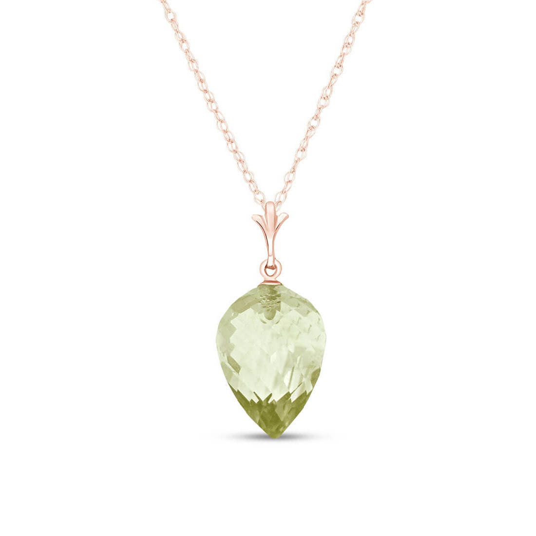 Green Amethyst Drop Pendant Necklace handcrafted in rose gold plated 9ct gold. Single 9.5 ct genuine amethyst. Pointed briolette cut. The pendant hangs from a rose gold double link rope chain with spring clasp. Size: 10.2 x 25.4 mm (0.4 x 1 in). Material: 9ct Rose Gold. Total metal weight: 3.14 gr. 1 pointed briolette cut green amethyst (15 x 10 mm) = 9.5 ct. Colour: Green. Stone cut: Pointed Briolette Cut. Anniversary: 6th Anniversary. Birthstone: February.