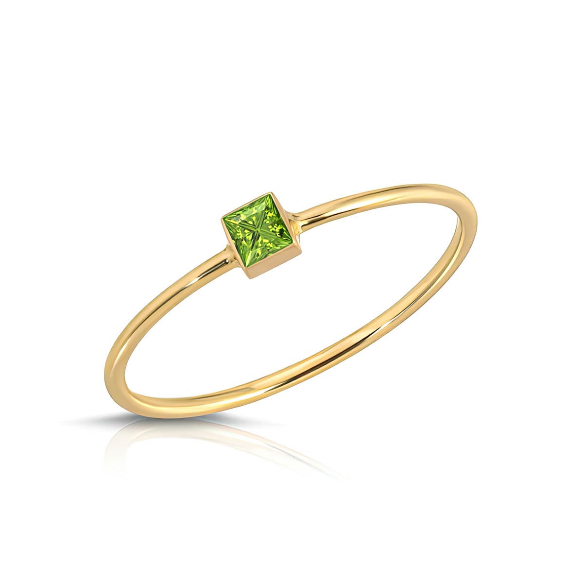 Peridot Ring handcrafted in 9ct Gold. Single 0.12 ct genuine peridot. Princess cut. Available from sizes H to Z including half sizes. Size: 1 x 20.6 mm (0.04 x 0.81 in). Material: 9ct Gold. Total metal weight: 0.6 gr. 1 princess cut peridot (2.5 x 2.5 mm) = 0.12 ct. Colour: Green. Stone cut: Princess cut. Anniversary: 16th Anniversary. Birthstone: August.
