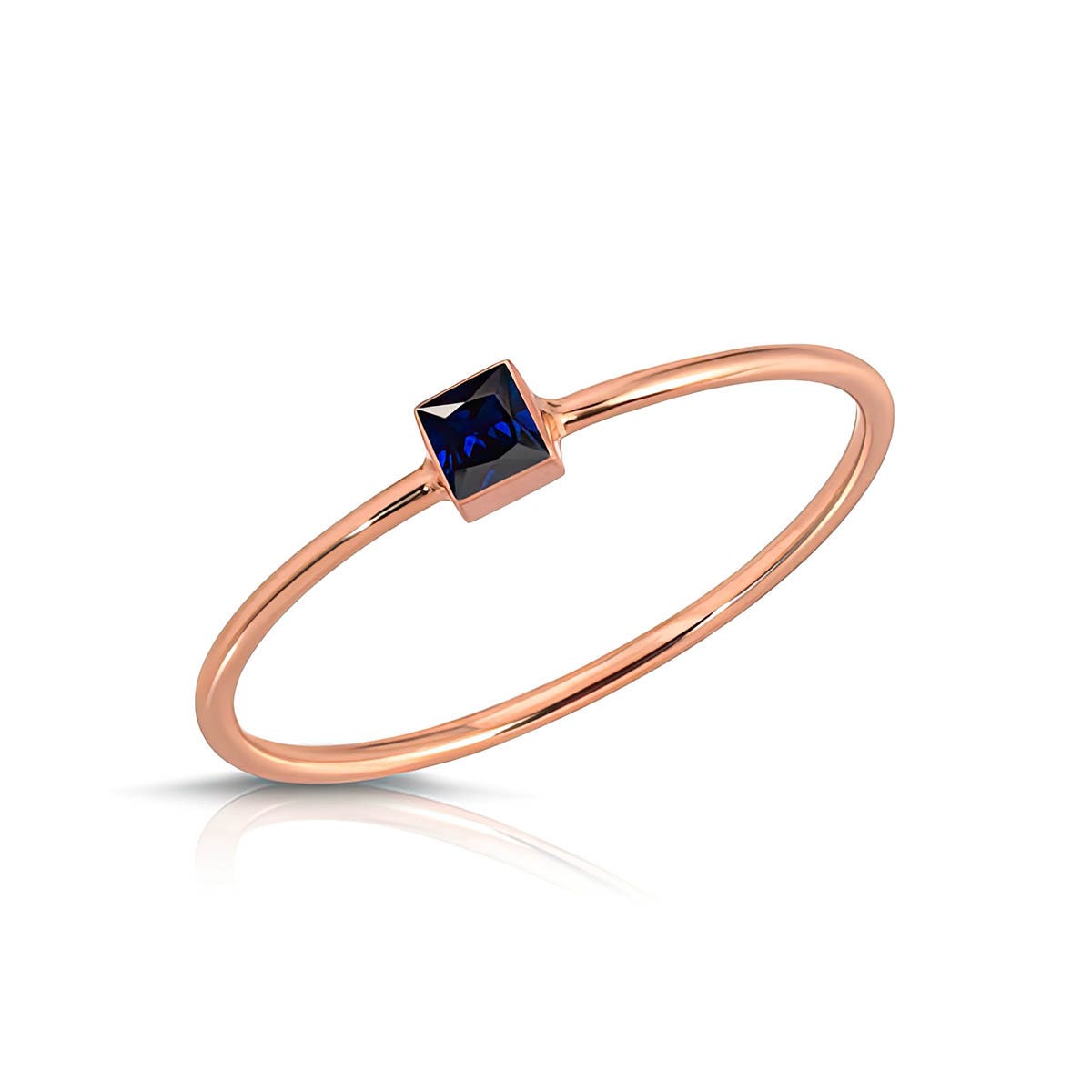 Sapphire Ring handcrafted in 9ct Rose Gold. Single 0.13 ct genuine sapphire. Princess cut. Available from sizes H to Z including half sizes. Size: 1 x 20.6 mm (0.04 x 0.81 in). Material: 9ct Rose Gold. Total metal weight: 0.6 gr. 1 princess cut sapphire (2.5 x 2.5 mm) = 0.13 ct. Colour: Blue. Stone cut: Princess cut. Anniversary: 5th Anniversary, 45th Anniversary. Birthstone: September.