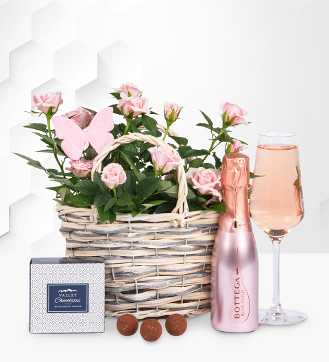 We have selected the finest bottle of Bottega Rose Prosecco to accompany this lovely rose plant. All neatly presented is a wicker basket to make a wonderful birthday. A fine gift for any occasion and one that will certainly impress at first sight! Contains: Rose Plant wrapped in hessian Bottega Rose Prosecco 20cl Delicious Chocolates (May contain nuts*) Hand Made Wicker basket and presented with a beautiful butterfly!