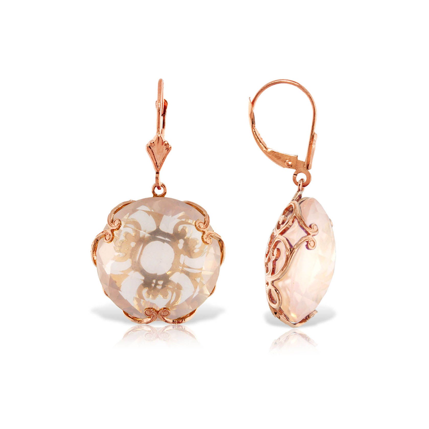 Rose Quartz Leverback Earrings handcrafted in rose gold plated 9ct gold. Two genuine quartz, total 34 ct for both earrings combined. Round cut. Size: 20.1 x 36.1 mm (0.79 x 1.42 in). Material: 9ct Rose Gold. Total metal weight: 7.7 gr. 2 round cut rose quartz (18 x 18 mm) = 34 ct total for pair. Colour: Pink. Stone cut: Round Cut.