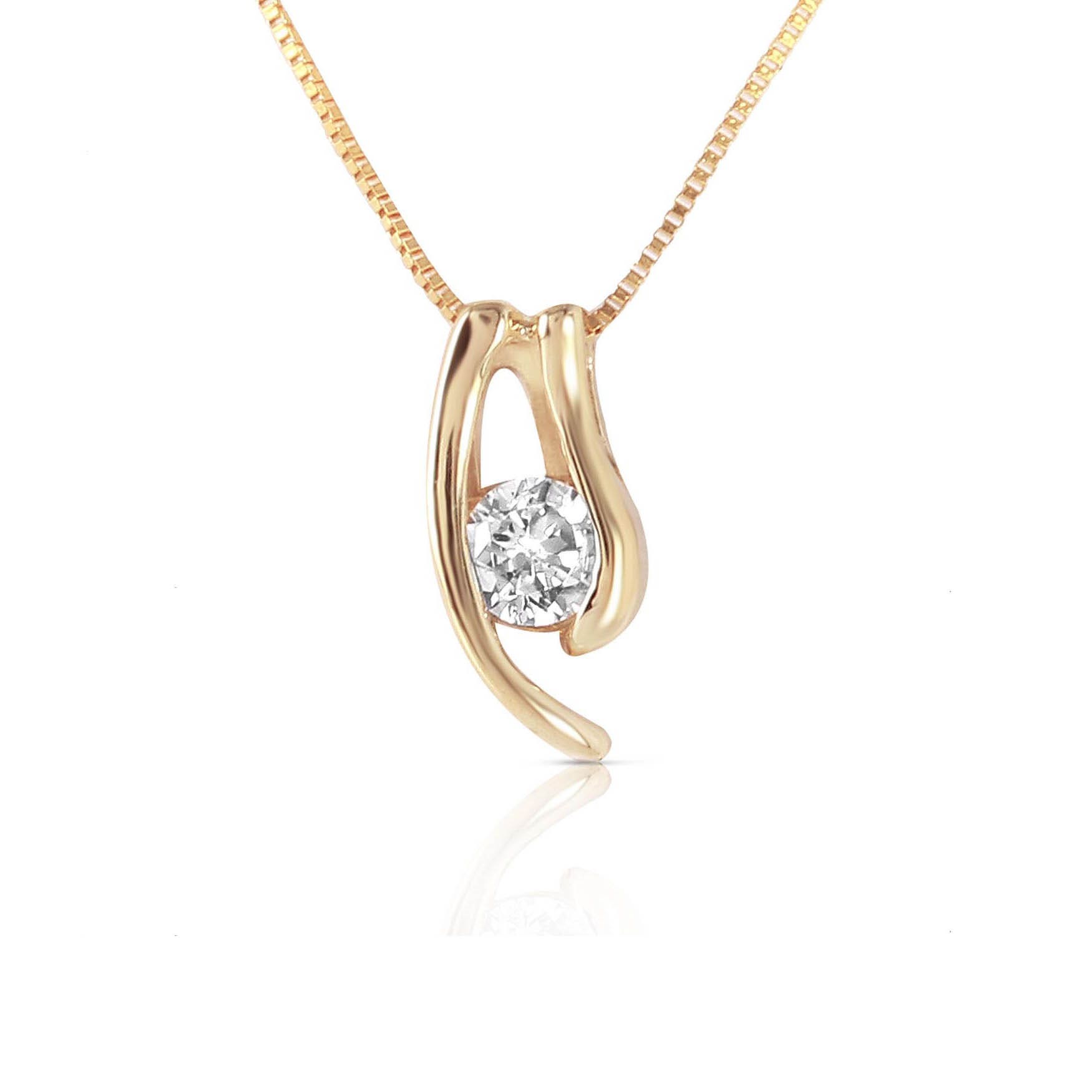 Diamond Pendant Necklace handcrafted in solid gold. Single 0.15 ct diamond. Round brilliant cut. The pendant is suspended from a gold box chain with spring clasp. Size: 4.8 x 9.7 mm (0.19 x 0.38 in). Material: 9ct Gold. Total metal weight: 1.8 gr. 1 round brilliant cut diamond (K colour, SI1 clarity) = 0.15 ct. Colour: Clear. Diamond colour: K. Stone cut: Round Cut. Anniversary: 10th Anniversary, 60th Anniversary. Birthstone: April.