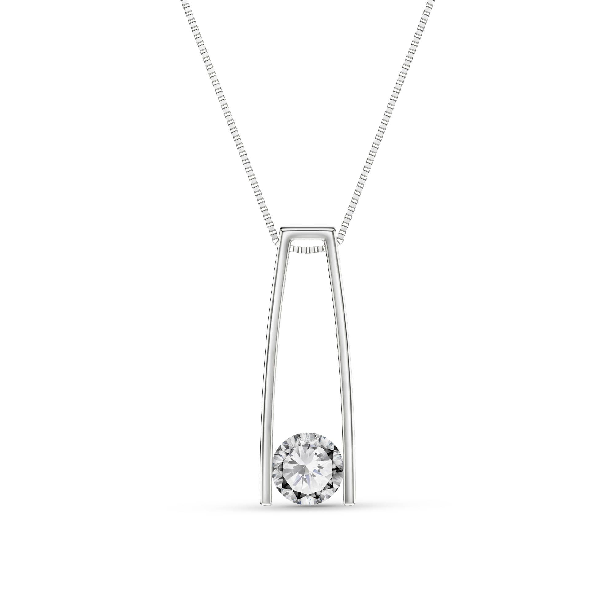 Diamond Pendant Necklace handcrafted in solid white gold. Single 0.25 ct diamond. Round brilliant cut. The pendant is suspended from a white gold box chain with spring clasp. Size: 6.1 x 16.5 mm (0.24 x 0.65 in). Material: 9ct White Gold. Total metal weight: 2.6 gr. 1 round brilliant cut diamond (H colour, SI1 clarity) = 0.25 ct. Colour: Clear. Diamond colour: H. Stone cut: Round Cut. Anniversary: 10th Anniversary, 60th Anniversary. Birthstone: April.