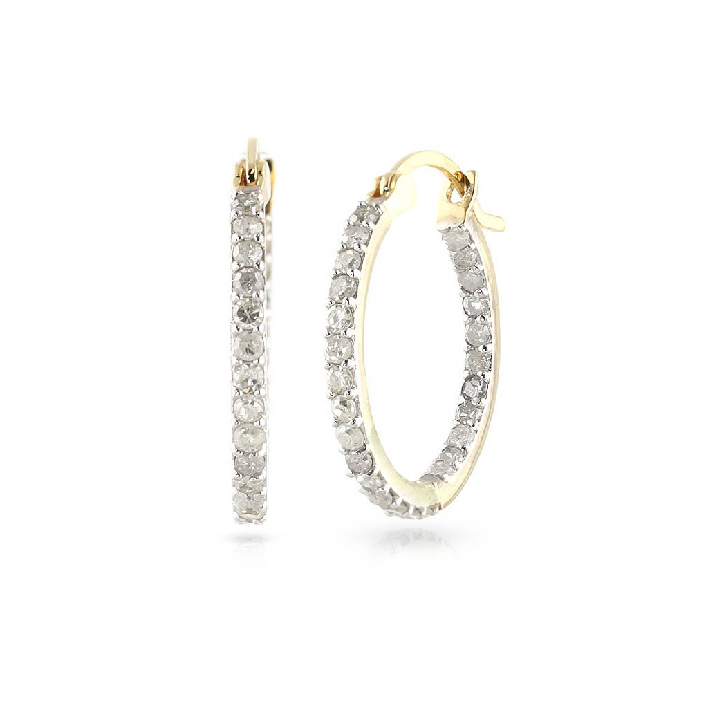 Diamond Hoop Earrings handcrafted in solid gold. 54 diamonds, total 0.75 ct for both earrings combined. Round cut. Size: 18.5 x 18.5 mm (0.73 x 0.73 in). Material: 9ct Gold. Total metal weight: 2.1 gr. 54 round cut diamonds (H colour, SI2 clarity) = 0.75 ct total for pair. Colour: Clear. Diamond colour: H. Stone cut: Round Cut. Anniversary: 10th Anniversary, 60th Anniversary. Birthstone: April.