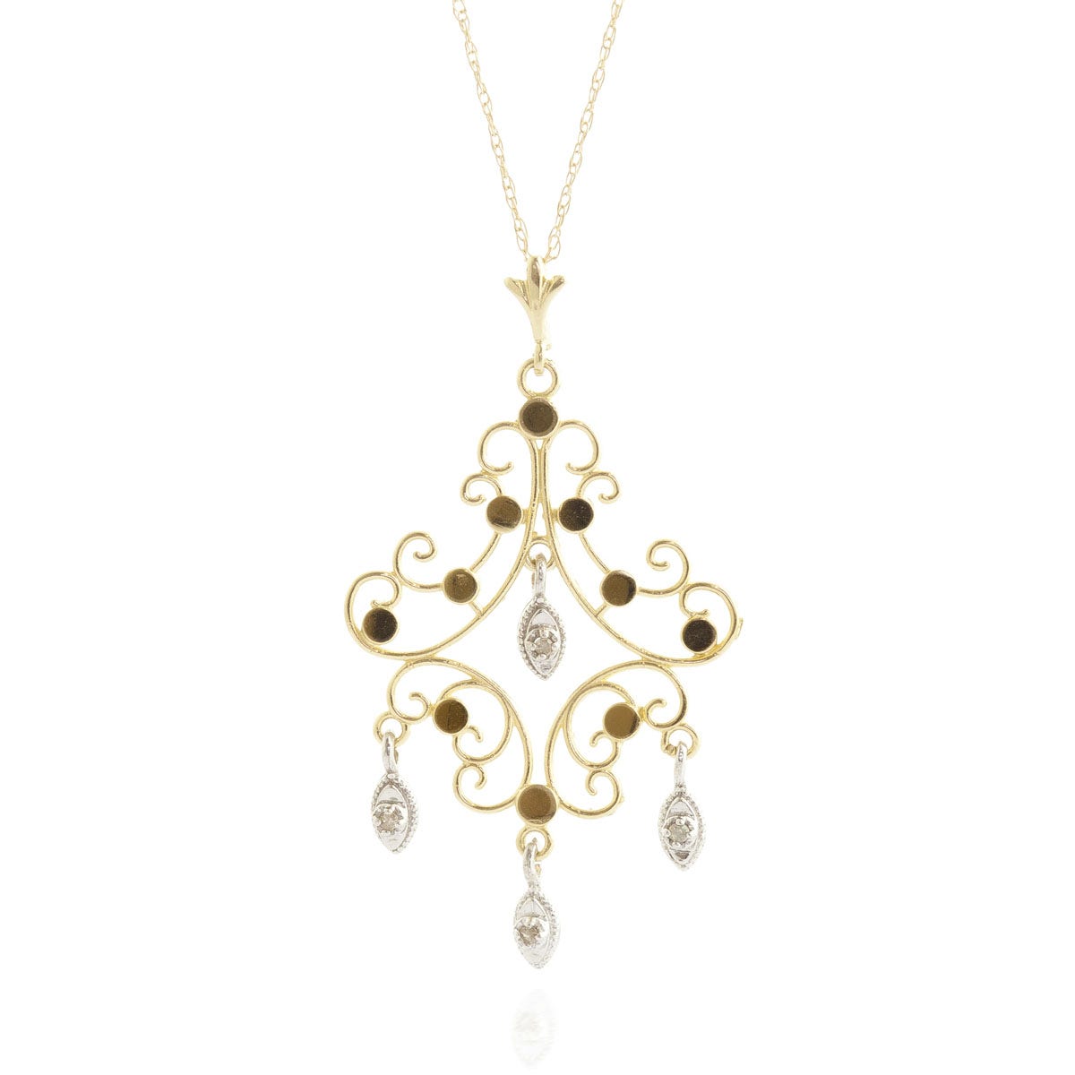 Diamond Pendant Necklace handcrafted in solid gold. Four diamonds, total 0.02 ct. Round cut. The pendant hangs from a gold double link rope chain with spring clasp. Size: 20.3 x 37.1 mm (0.8 x 1.46 in). Material: 9ct Gold. Total metal weight: 2.04 gr. 4 round cut diamonds (K colour, SI2 clarity) = 0.02 ct total. Colour: Clear. Diamond colour: K. Stone cut: Round Cut. Anniversary: 10th Anniversary, 60th Anniversary. Birthstone: April.