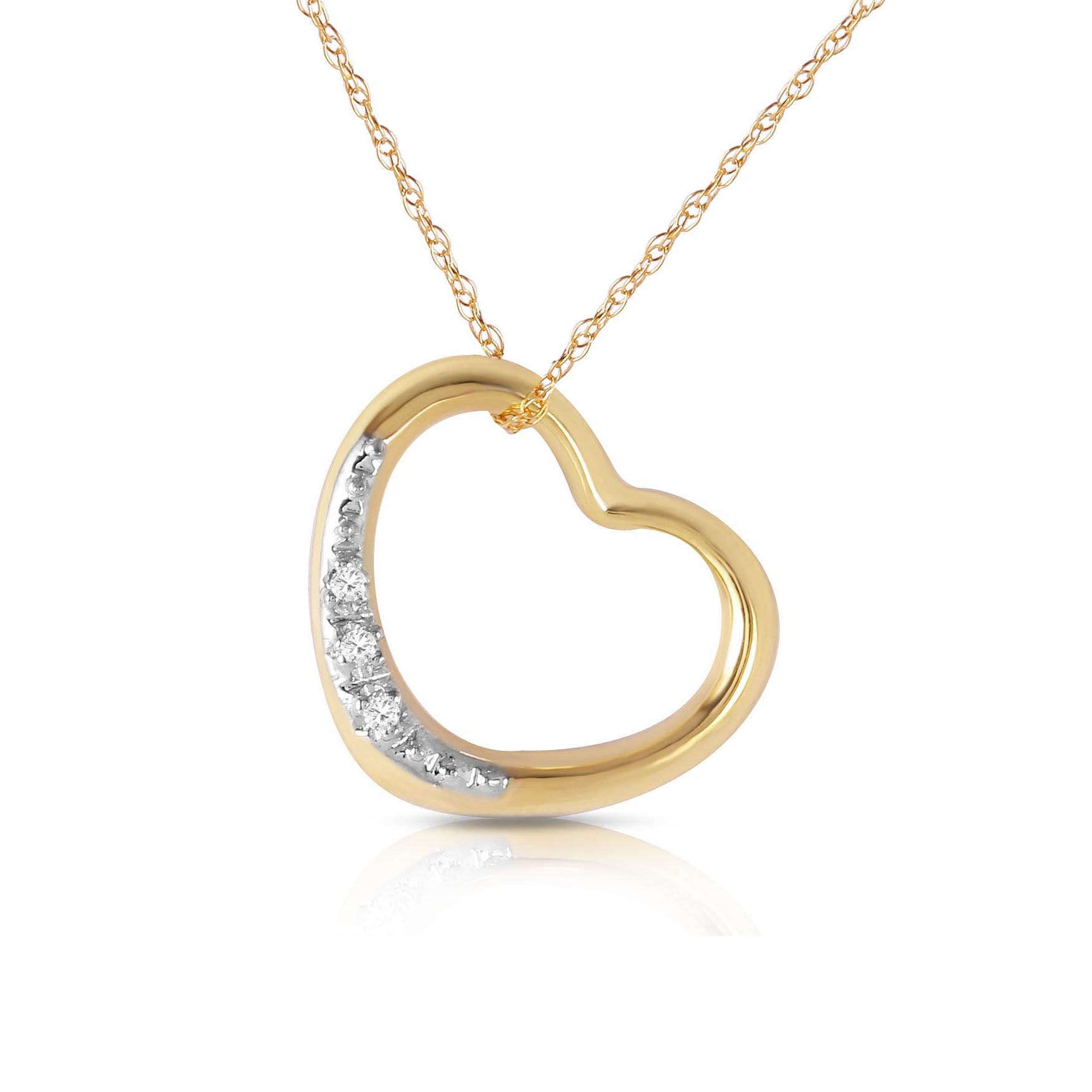 Diamond Pendant Necklace handcrafted in solid gold. Three diamonds, total 0.03 ct. Round cut. The pendant is suspended from a gold double link rope chain with spring clasp. Size: 16.5 x 14.5 mm (0.65 x 0.57 in). Material: 9ct Gold. Total metal weight: 1.94 gr. 3 round cut diamonds (G colour, SI2 clarity) = 0.03 ct total. Colour: Clear. Diamond colour: G. Stone cut: Round Cut. Anniversary: 10th Anniversary, 60th Anniversary. Birthstone: April.