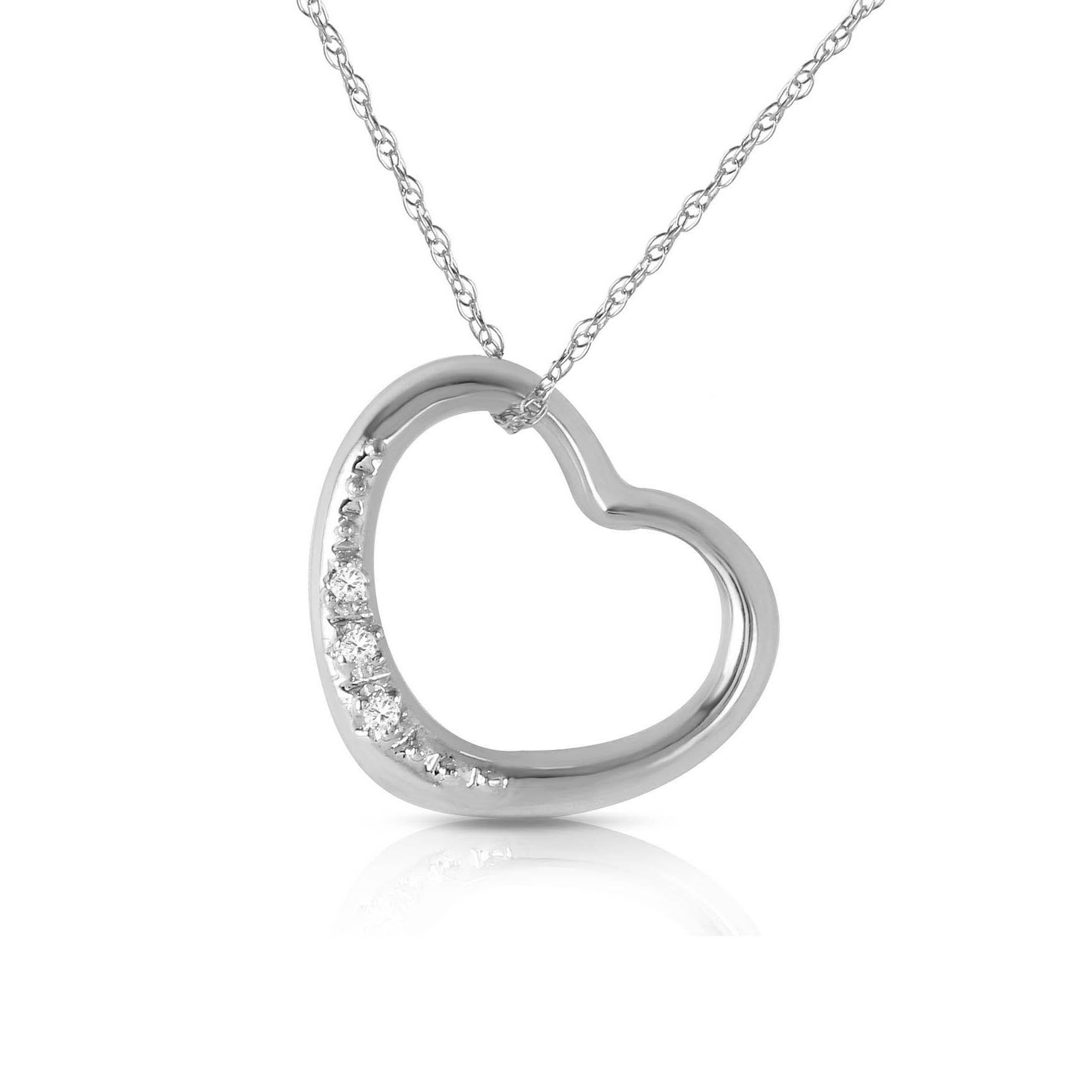 Diamond Pendant Necklace handcrafted in solid white gold. Three diamonds, total 0.03 ct. Round cut. The pendant is suspended from a white gold double link rope chain with spring clasp. Size: 16.5 x 14.5 mm (0.65 x 0.57 in). Material: 9ct White Gold. Total metal weight: 1.94 gr. 3 round cut diamonds (G colour, SI2 clarity) = 0.03 ct total. Colour: Clear. Diamond colour: G. Stone cut: Round Cut. Anniversary: 10th Anniversary, 60th Anniversary. Birthstone: April.