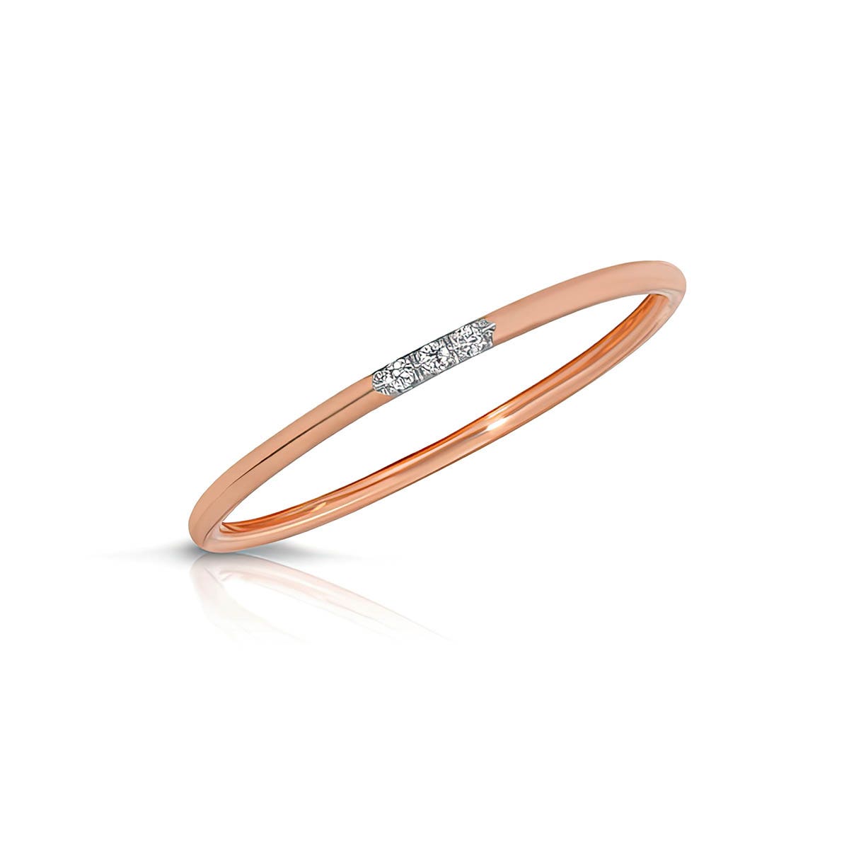 Diamond Ring handcrafted in 9ct Rose Gold. Three diamonds, total 0.03 ct. Round cut. Available from sizes H to Z including half sizes. Size: 1.3 x 18.8 mm (0.05 x 0.74 in). Material: 9ct Rose Gold. Total metal weight: 0.6 gr. 3 round cut diamonds (F colour, SI2 clarity) = 0.03 ct total. Colour: Clear. Diamond colour: F. Stone cut: Round cut. Anniversary: 10th Anniversary, 60th Anniversary. Birthstone: April.