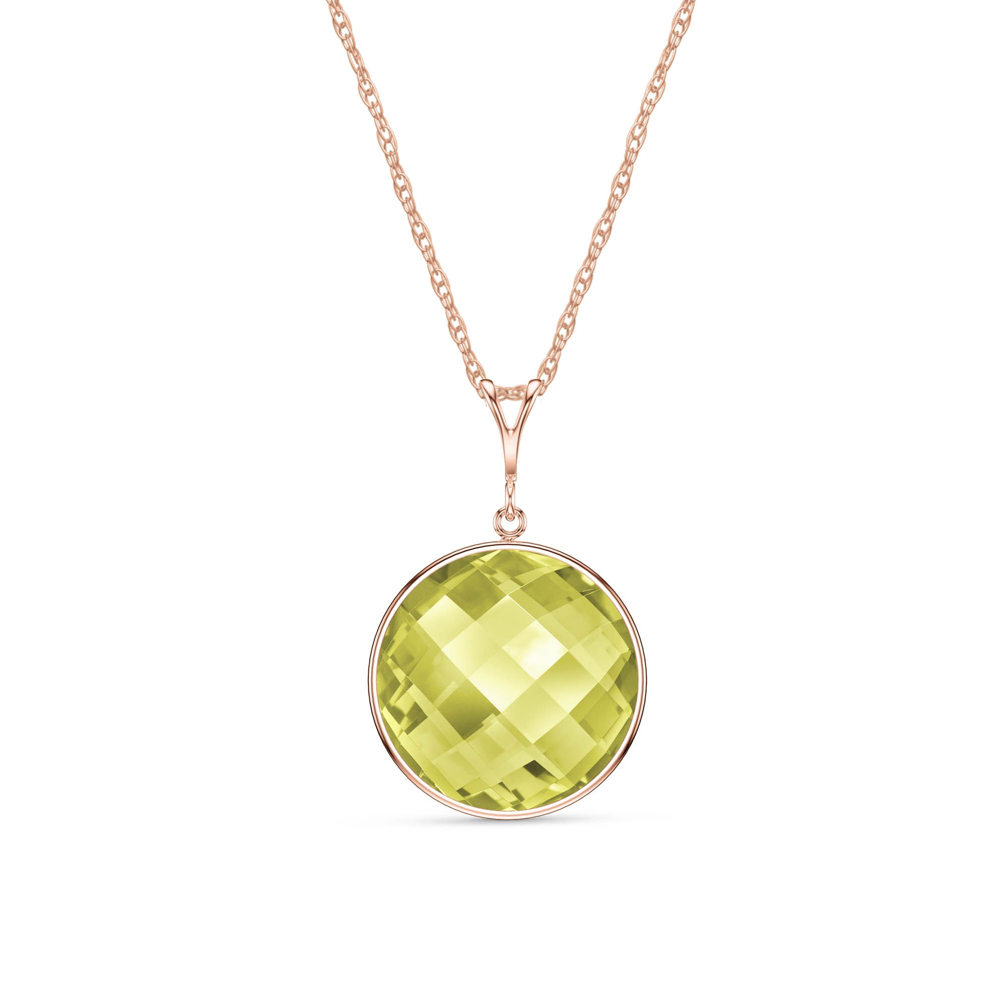 Pendant Necklace handcrafted in rose gold plated 9ct gold. Single 17 ct genuine quartz. Round cut. The pendant is suspended from a rose gold double link rope chain with spring clasp. Size: 18.5 x 27.9 mm (0.73 x 1.1 in). Material: 9ct Rose Gold. Total metal weight: 2.24 gr. 1 round cut lemon quartz (18 x 18 mm) = 17 ct. Colour: Yellow. Stone cut: Round Cut.