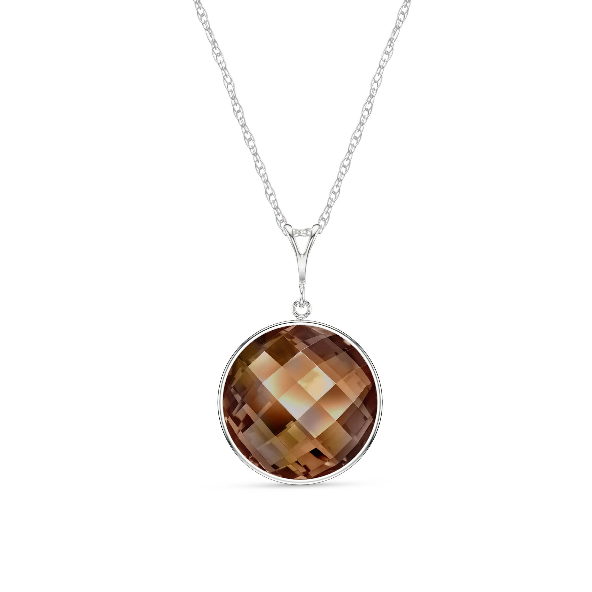 Smoky Quartz Pendant Necklace handcrafted in solid white gold. Single 17 ct genuine quartz. Round cut. The pendant is suspended from a white gold double link rope chain with spring clasp. Size: 18.5 x 27.9 mm (0.73 x 1.1 in). Material: 9ct White Gold. Total metal weight: 2.24 gr. 1 round cut smoky quartz (18 x 18 mm) = 17 ct. Colour: Brown. Stone cut: Round Cut.
