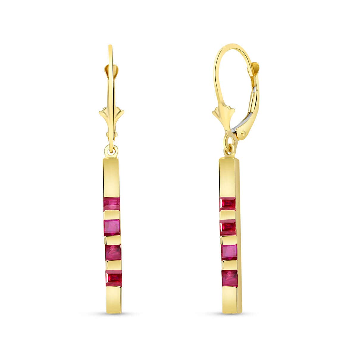 Ruby Leverback Bar Earrings handcrafted in solid gold. Eight genuine rubies, total 0.7 ct for both earrings combined. Princess cut. Size: 2.8 x 40.4 mm (0.11 x 1.59 in). Material: 9ct Gold. Total metal weight: 2.7 gr. 8 princess cut rubies (2.5 x 2.5 mm, VS1 clarity) = 0.7 ct total for pair. Colour: Red. Stone cut: Princess Cut. Anniversary: 15th Anniversary, 40th Anniversary. Birthstone: July.