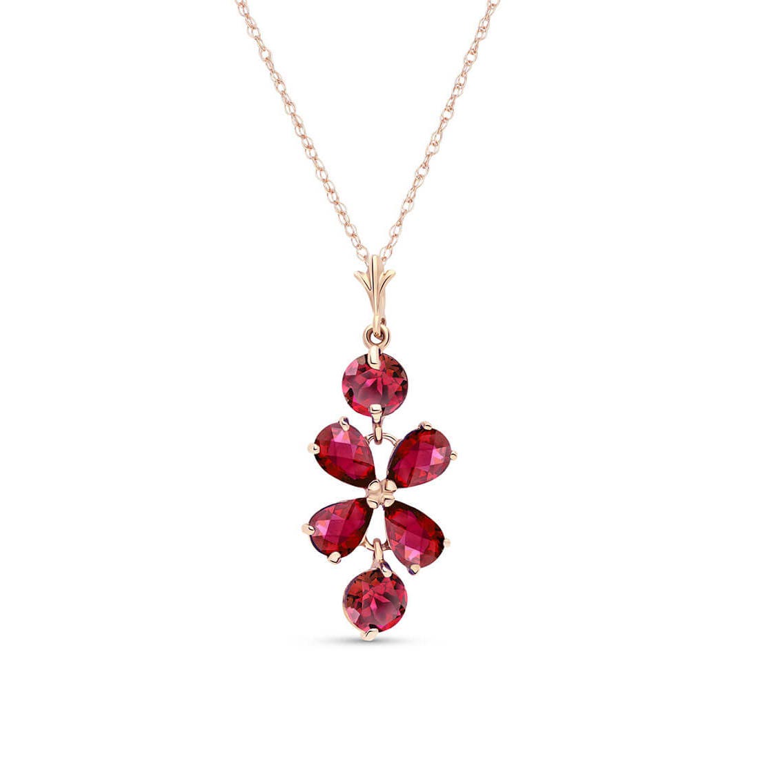 Ruby Pendant Necklace handcrafted in rose gold plated 9ct gold. Six gemstones, total 3.15 ct. Pear cut. The pendant hangs from a rose gold double link rope chain with spring clasp. Size: 11.9 x 30.5 mm (0.47 x 1.2 in). Material: 9ct Rose Gold. Total metal weight: 2.34 gr. 4 pear cut rubies (6 x 4 mm, VS1 clarity) = 2.15 ct total. 2 round cut rubies (5 x 5 mm, VS1 clarity) = 1 ct total. Colour: Red. Stone cut: Pear Cut. Anniversary: 15th Anniversary, 40th Anniversary. Birthstone: July.