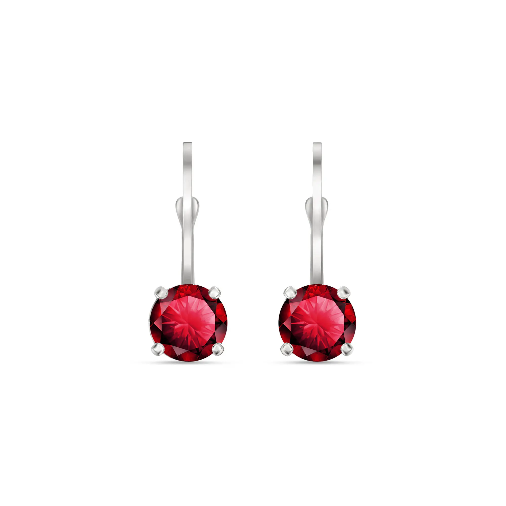 Ruby Leverback Earrings handcrafted in solid white gold. Two genuine rubies, total 1.2 ct for both earrings combined. Round cut. Size: 5.1 x 14.7 mm (0.2 x 0.58 in). Material: 9ct White Gold. Total metal weight: 1.5 gr. 2 round cut rubies (5 x 5 mm, VS1 clarity) = 1.2 ct total for pair. Colour: Red. Stone cut: Round Cut. Anniversary: 15th Anniversary, 40th Anniversary. Birthstone: July.