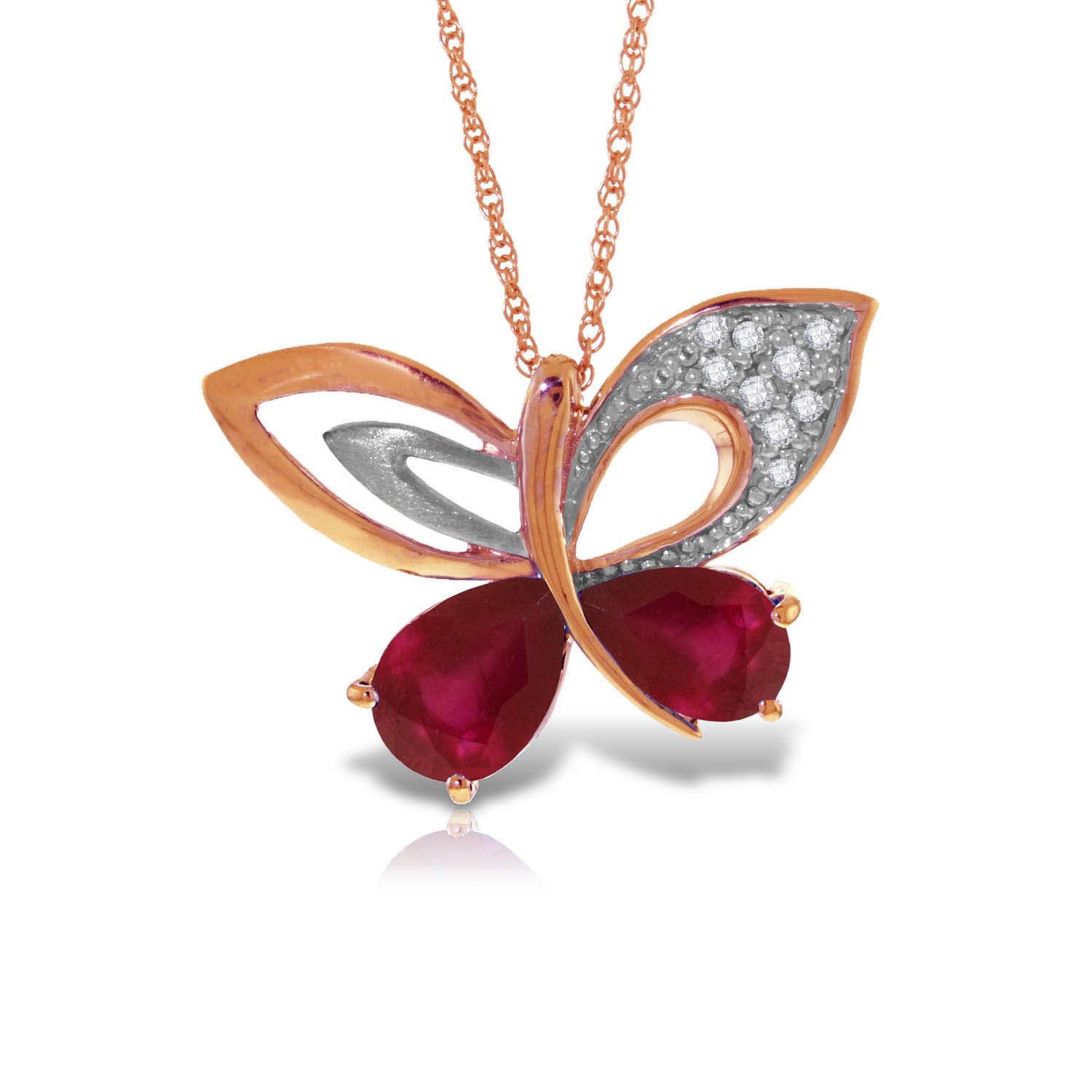 Ruby & Diamond Butterfly Pendant Necklace handcrafted in rose gold plated 9ct gold. Two gemstones, total 4.2 ct, nine diamonds, total 0.18 ct. Pear cut. The pendant is suspended from a rose gold double link rope chain with spring clasp. Size: 27.9 x 19.8 mm (1.1 x 0.78 in). Material: 9ct Rose Gold. Total metal weight: 4.24 gr. 1 pear cut ruby (10 x 7 mm, VS1 clarity) = 2.5 ct. 1 pear cut ruby (9 x 6 mm, VS1 clarity) = 1.7 ct. 9 round cut diamonds (K colour, I3 clarity) = 0.18 ct total. Colour: Red. Stone cut: Pear Cut. Anniversary: 15th Anniversary, 40th Anniversary. Birthstone: July.