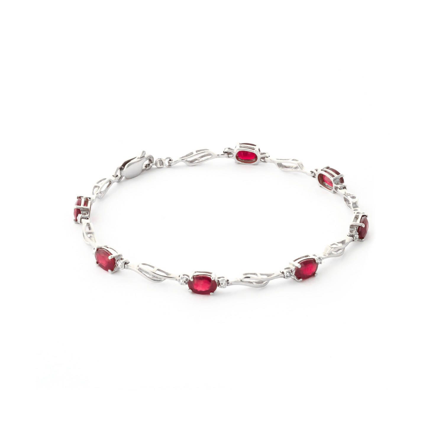 Ruby & Diamond Tennis Bracelet handcrafted in solid white gold. Seven genuine rubies, total 4.2 ct, two diamonds, total 0.02 ct. Oval cut. Fastened by white gold lobster clasp. Fits wrist up to 8.5″. Size: 4.3 mm (0.17 in). Material: 9ct White Gold. Total metal weight: 4.1 gr. 7 oval cut rubies (6 x 4 mm, VS1 clarity) = 4.2 ct total. 2 round cut diamonds (K colour, SI2 clarity) = 0.02 ct total. Colour: Red. Stone cut: Oval Cut. Anniversary: 15th Anniversary, 40th Anniversary. Birthstone: July.