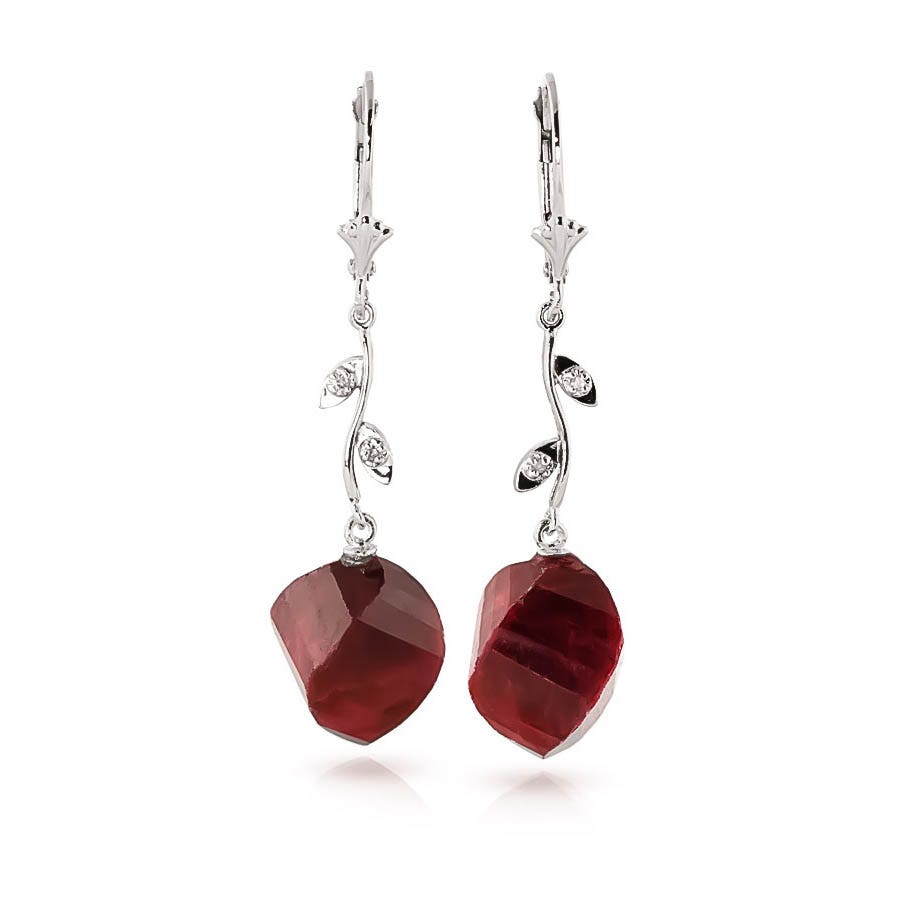 Ruby & Diamond Chandelier Earrings handcrafted in solid white gold. Two genuine rubies, total 30.5 ct, four diamonds, total 0.02 ct for both earrings combined. Twisted briolette cut. Size: 12.7 x 47.8 mm (0.5 x 1.88 in). Material: 9ct White Gold. Total metal weight: 6.5 gr. 2 twisted briolette cut rubies (15 x 13 mm, VS1 clarity) = 30.5 ct total for pair. 4 round cut diamonds (K colour, I3 clarity) = 0.02 ct total for pair. Colour: Red. Stone cut: Twisted Briolette Cut. Anniversary: 15th Anniversary, 40th Anniversary. Birthstone: July.