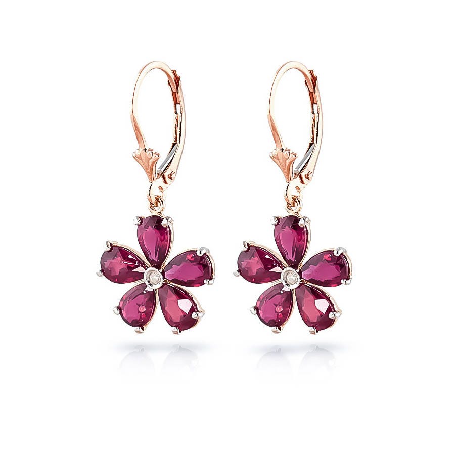 Ruby & Diamond Leverback Earrings handcrafted in rose gold plated 9ct gold. Ten genuine rubies, total 4.4 ct, two diamonds, total 0.03 ct for both earrings combined. Pear cut. Size: 14.2 x 30.2 mm (0.56 x 1.19 in). Material: 9ct Rose Gold. Total metal weight: 3.1 gr. 10 pear cut rubies (6 x 4 mm, VS1 clarity) = 4.4 ct total for pair. 2 round cut diamonds (K colour, SI1 clarity) = 0.03 ct total for pair. Colour: Red. Stone cut: Pear Cut. Anniversary: 15th Anniversary, 40th Anniversary. Birthstone: July.