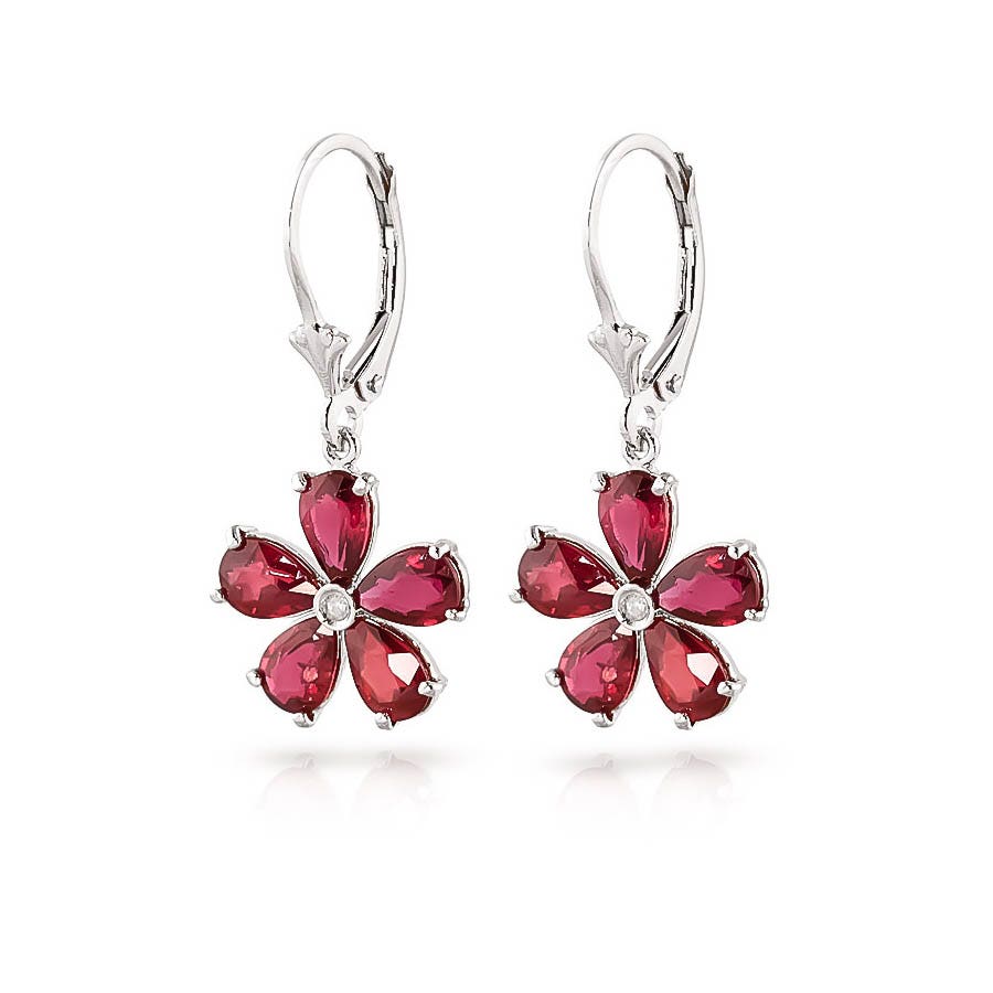 Ruby & Diamond Leverback Earrings handcrafted in solid white gold. Ten genuine rubies, total 4.4 ct, two diamonds, total 0.03 ct for both earrings combined. Pear cut. Size: 14.2 x 30.2 mm (0.56 x 1.19 in). Material: 9ct White Gold. Total metal weight: 3.1 gr. 10 pear cut rubies (6 x 4 mm, VS1 clarity) = 4.4 ct total for pair. 2 round cut diamonds (K colour, SI1 clarity) = 0.03 ct total for pair. Colour: Red. Stone cut: Pear Cut. Anniversary: 15th Anniversary, 40th Anniversary. Birthstone: July.