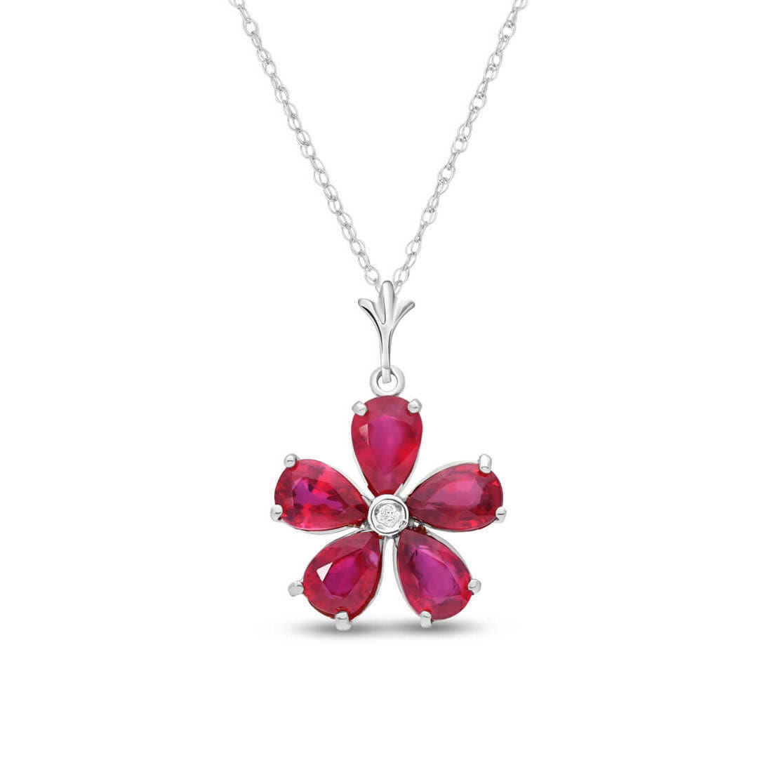 Ruby & Diamond Pendant Necklace handcrafted in solid white gold. Five genuine rubies, total 2.2 ct, single 0.02 ct diamond. Pear cut. The pendant hangs from a white gold double link rope chain with spring clasp. Size: 14.2 x 22.4 mm (0.56 x 0.88 in). Material: 9ct White Gold. Total metal weight: 2.24 gr. 5 pear cut rubies (6 x 4 mm, VS1 clarity) = 2.2 ct total. 1 round brilliant cut diamond (K colour, SI1 clarity) = 0.02 ct. Colour: Red. Stone cut: Pear Cut. Anniversary: 15th Anniversary, 40th Anniversary. Birthstone: July.