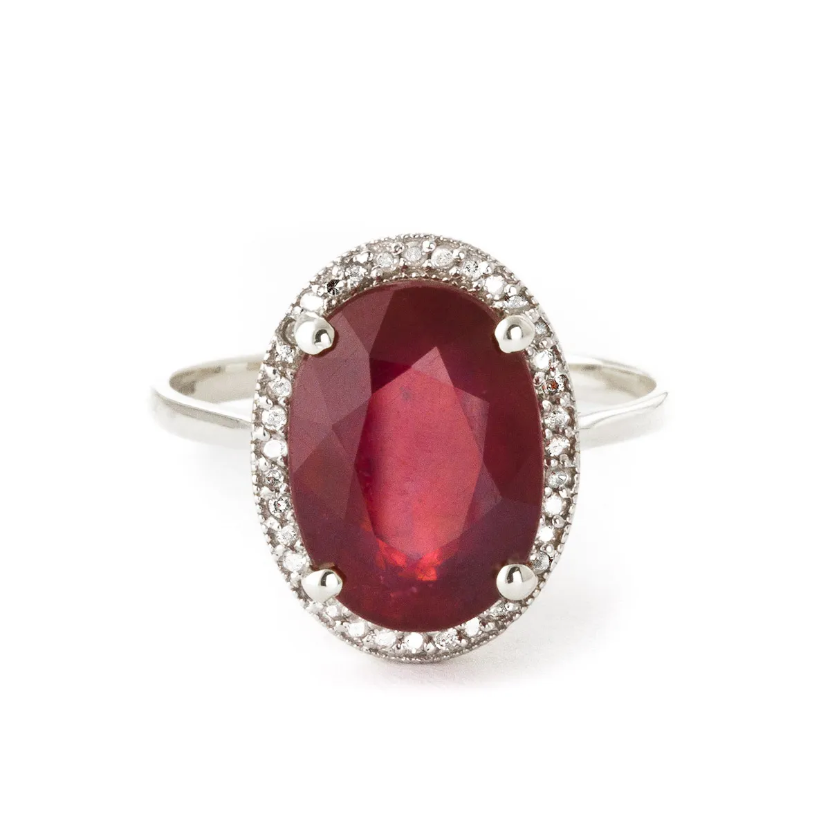 Ruby & Diamond Ring handcrafted in solid 18ct white gold. Single 7.75 ct genuine ruby, 36 diamonds, total 0.18 ct. Oval cut. Available from sizes H to Z including half sizes. Size: 17.3 mm (0.68 in). Material: 18ct White Gold. Total metal weight: 5.6 gr. 1 oval cut ruby (14 x 10 mm, VS1 clarity) = 7.75 ct. 36 round cut diamonds (K colour, I3 clarity) = 0.18 ct total. Colour: Red. Stone cut: Oval Cut. Anniversary: 15th Anniversary, 40th Anniversary. Birthstone: July.
