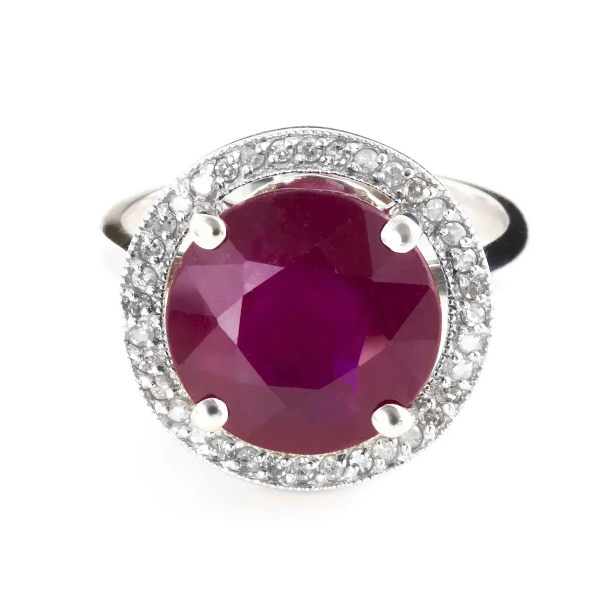 Ruby & Diamond Ring handcrafted in solid white gold. Single 8.5 ct genuine ruby, 36 diamonds, total 0.2 ct. Round cut. Available from sizes H to Z including half sizes. Size: 16.3 mm (0.64 in). Material: 9ct White Gold. Total metal weight: 4.3 gr. 1 round cut ruby (12 x 12 mm, VS1 clarity) = 8.5 ct. 36 round cut diamonds (K colour, I3 clarity) = 0.2 ct total. Colour: Red. Stone cut: Round Cut. Anniversary: 15th Anniversary, 40th Anniversary. Birthstone: July.