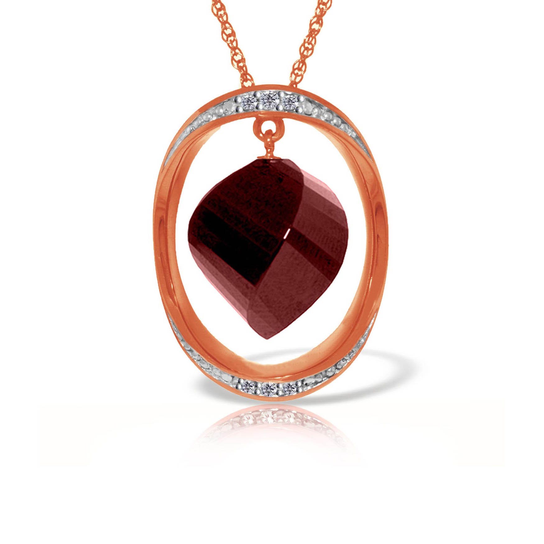 Ruby & Diamond Pendant Necklace handcrafted in rose gold plated 9ct gold. Single 15.25 ct genuine ruby, six diamonds, total 0.1 ct. Twisted briolette cut. The pendant hangs from a rose gold double link rope chain with spring clasp. Size: 19.1 x 25.4 mm (0.75 x 1 in). Material: 9ct Rose Gold. Total metal weight: 6.34 gr. 1 twisted briolette cut ruby (15 x 13 mm, VS1 clarity) = 15.25 ct. 6 round cut diamonds (G colour, SI1 clarity) = 0.1 ct total. Colour: Red. Stone cut: Twisted Briolette Cut. Anniversary: 15th Anniversary, 40th Anniversary. Birthstone: July.