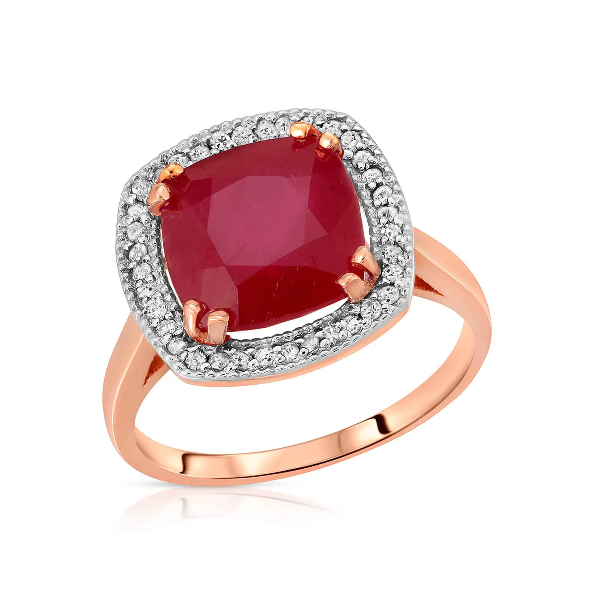 Ruby & Diamond Ring handcrafted in solid rose gold. Single 6.7 ct genuine ruby, 36 diamonds, total 0.2 ct. Cushion cut. Available from sizes H to Z including half sizes. Size: 14 mm (0.55 in). Material: 9ct Rose Gold. Total metal weight: 4.3 gr. 1 cushion cut ruby (10 x 10 mm, VS1 clarity) = 6.7 ct. 36 round cut diamonds (H colour, SI1 clarity) = 0.2 ct total. Colour: Red. Stone cut: Cushion Cut. Anniversary: 15th Anniversary, 40th Anniversary. Birthstone: July.